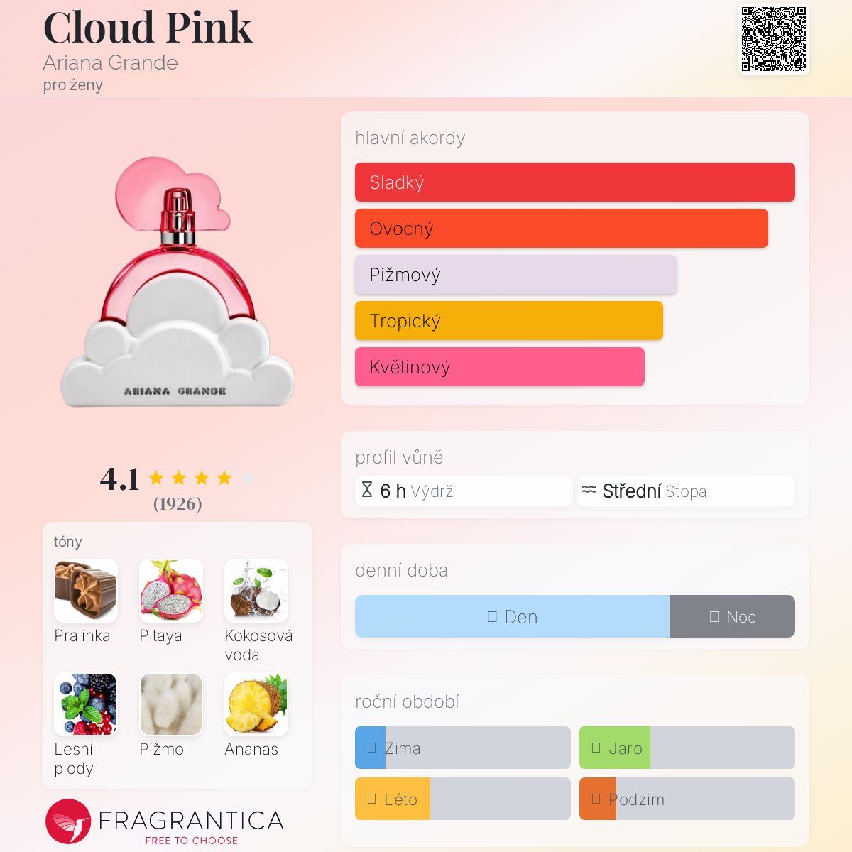 Cloud Pink podle Ariana Grande je Orientální Vanilla vůně pro ženy. Toto je nová vůně. Cloud Pink byl/a uveden/a v roce 2023. "Nosem" za touto vůní je Clement Gavarry. Vrchní tóny jsou Pitaya, Lesní plody a Ananas; střední tóny jsouKokosová voda, Vanilková orchidej a Ambrette (přírodní pižmo) ; základní tóny jsou Pralinka, Pižmo, Jantarové dřevo a Mech.