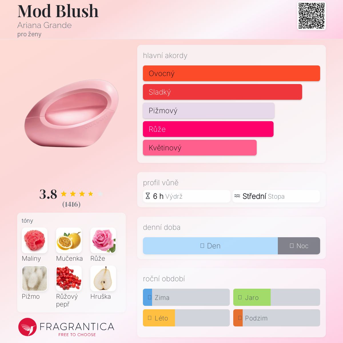 Mod Blush podle Ariana Grande je vůně pro ženy. Mod Blush byl/a uveden/a v roce 2022. "Nosem" za touto vůní je Frank Voelkl. Vrchní tóny jsou Maliny, Mučenka, Růžový pepř a Bergamot; střední tóny jsouRůže, Hruška a Magnólie ; základní tóny jsou Pižmo, Ambroxan, Dreamwood a Santalové dřevo.