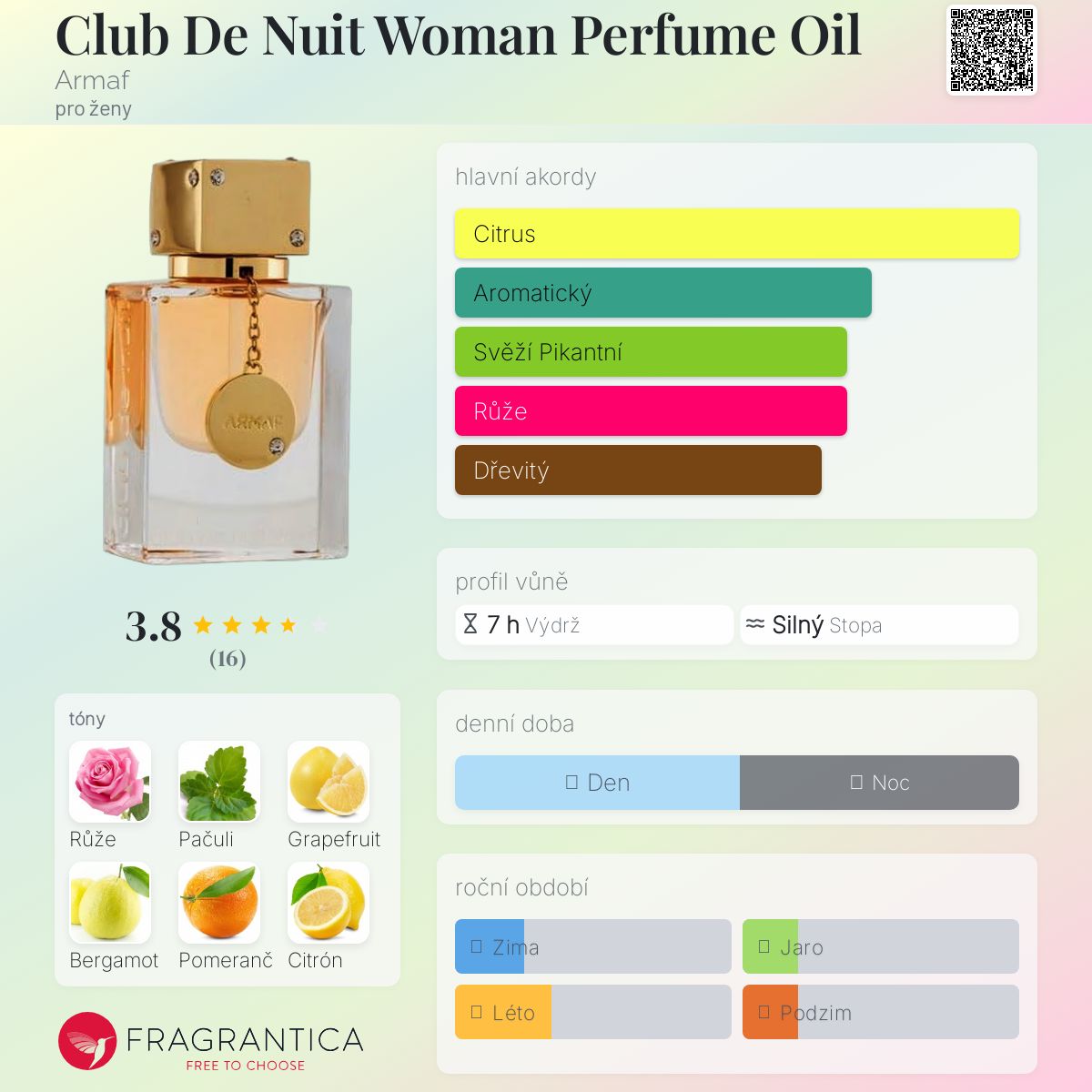 Club De Nuit Woman Perfume Oil podle Armaf je Floral Fruity vůně pro ženy. Club De Nuit Woman Perfume Oil byl/a uveden/a v roce 2022. Vrchní tóny jsou Grapefruit, Bergamot, Pomeranč, Citrón a Broskev; střední tóny jsouRůže, Pelargónie, Jasmín a Liči ; základní tóny jsou Pačuli, Vetiver, Vanilka a Pižmo.