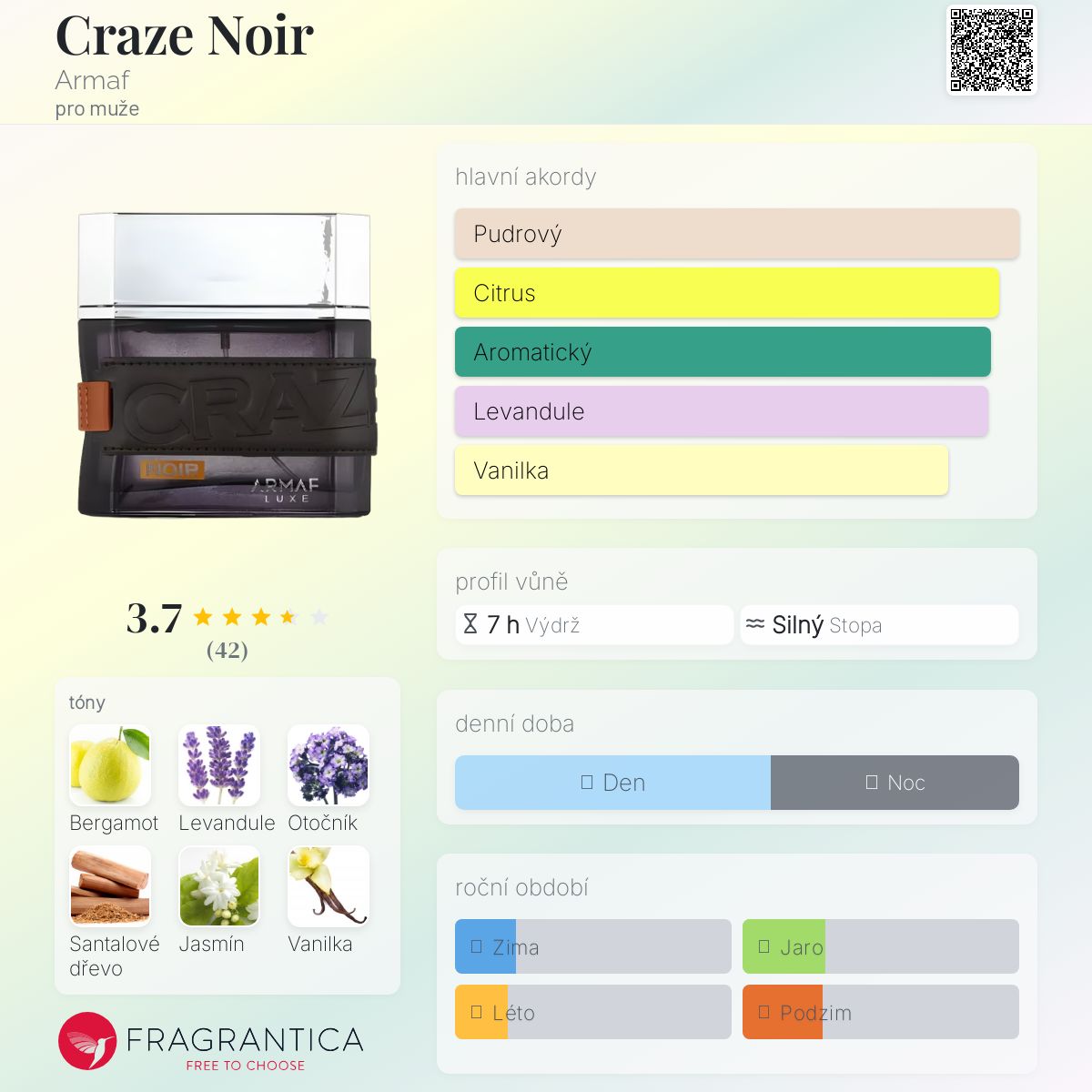 Craze Noir podle Armaf je Orientální Fougere vůně pro muže. Craze Noir byl/a uveden/a v roce 2018. Vrchní tóny jsou Bergamot, Otočník a Kmín; střední tóny jsouLevandule, Jasmín, Mandle a Šalvěj ; základní tóny jsou Santalové dřevo, Vanilka a Jantar (ambra).