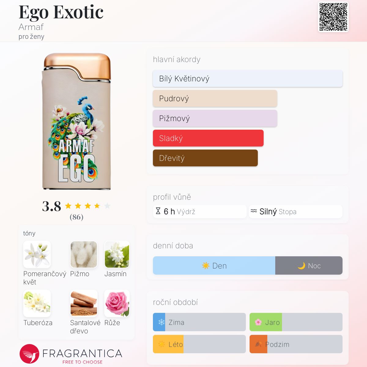 Ego Exotic podle Armaf je vůně pro ženy. Ego Exotic byl/a uveden/a v roce 2023. Vrchní tóny jsou Pomerančový květ a Broskev; střední tóny jsouJasmín Sambac, Tuberóza a Růže ; základní tóny jsou Pižmo, Santalové dřevo, Kosatec a Pralinka.