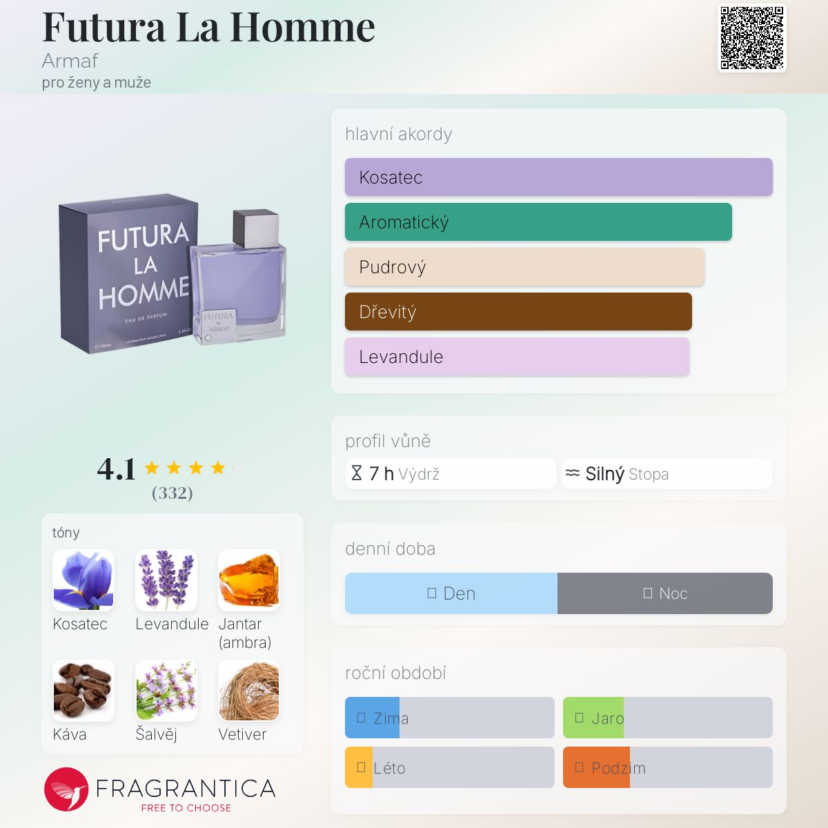 Futura La Homme podle Armaf je Aromatic Fougere vůně pro ženy a muže. Futura La Homme byla spuštěna během 2010. Vrchní tóny jsou Levandule, Šalvěj a Bergamot; střední tóny jsouKosatec, Jantar (ambra) a Káva ; základní tóny jsou Vetiver, Kůže a Cedr.