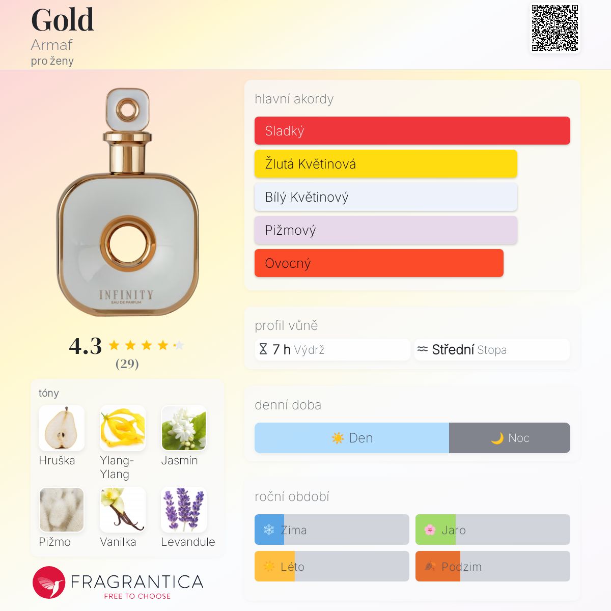 Gold podle Armaf je Floral Woody Musk vůně pro ženy. Toto je nová vůně. Gold byl/a uveden/a v roce 2024. Vrchní tóny jsou Hruška, Levandule a Růže; střední tóny jsouYlang-Ylang a Jasmín ; základní tóny jsou Pižmo, Vanilka a Mech.