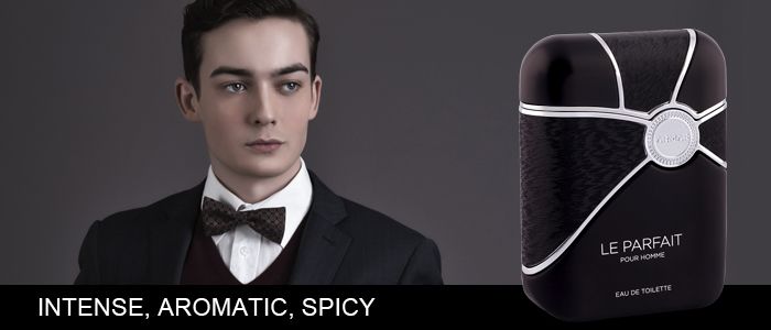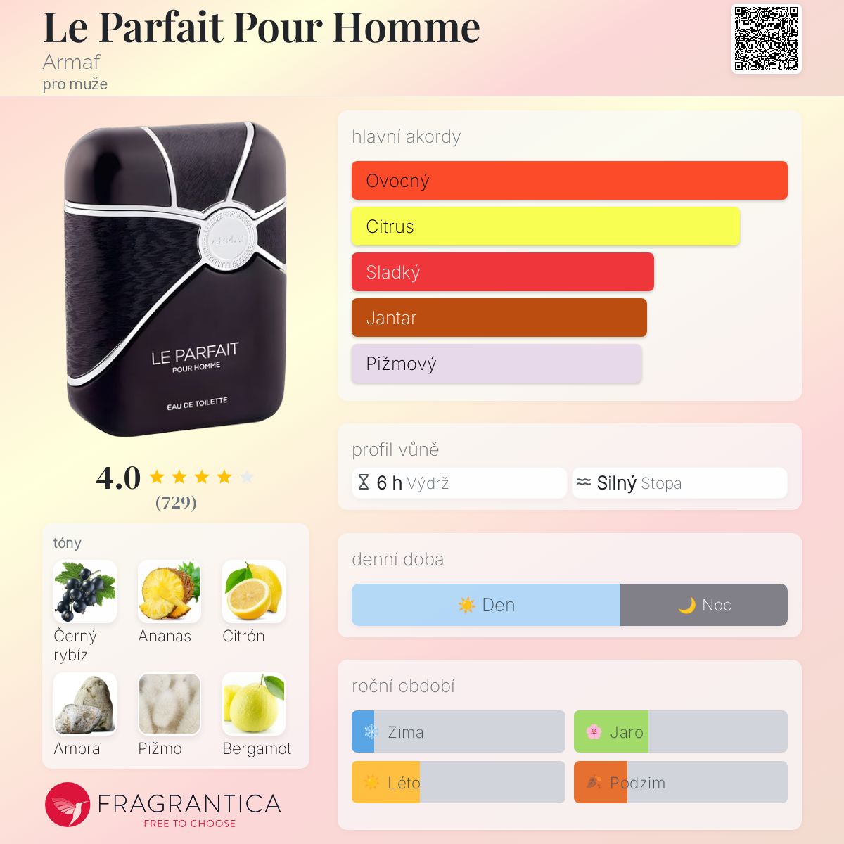 Le Parfait Pour Homme podle Armaf je Orientální vůně pro muže. Vrchní tóny jsou Černý rybíz, Ananas, Citrón a Bergamot; střední tóny jsouKořeněné tóny, Jasmín a Růže ; základní tóny jsou Ambra, Pižmo, Pačuli a Vanilka.