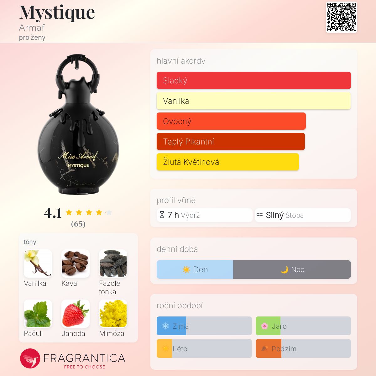 Mystique podle Armaf je vůně pro ženy. Mystique byl/a uveden/a v roce 2023. Vrchní tóny jsou Hruška, Mandarinka, Bergamot a Pomeranč; střední tóny jsouVanilka, Jahoda, Mimóza, Růže, Ylang-Ylang, Jasmín a Mučenka ; základní tóny jsou Vanilka, Káva, Fazole tonka, Pačuli a Vetiver.