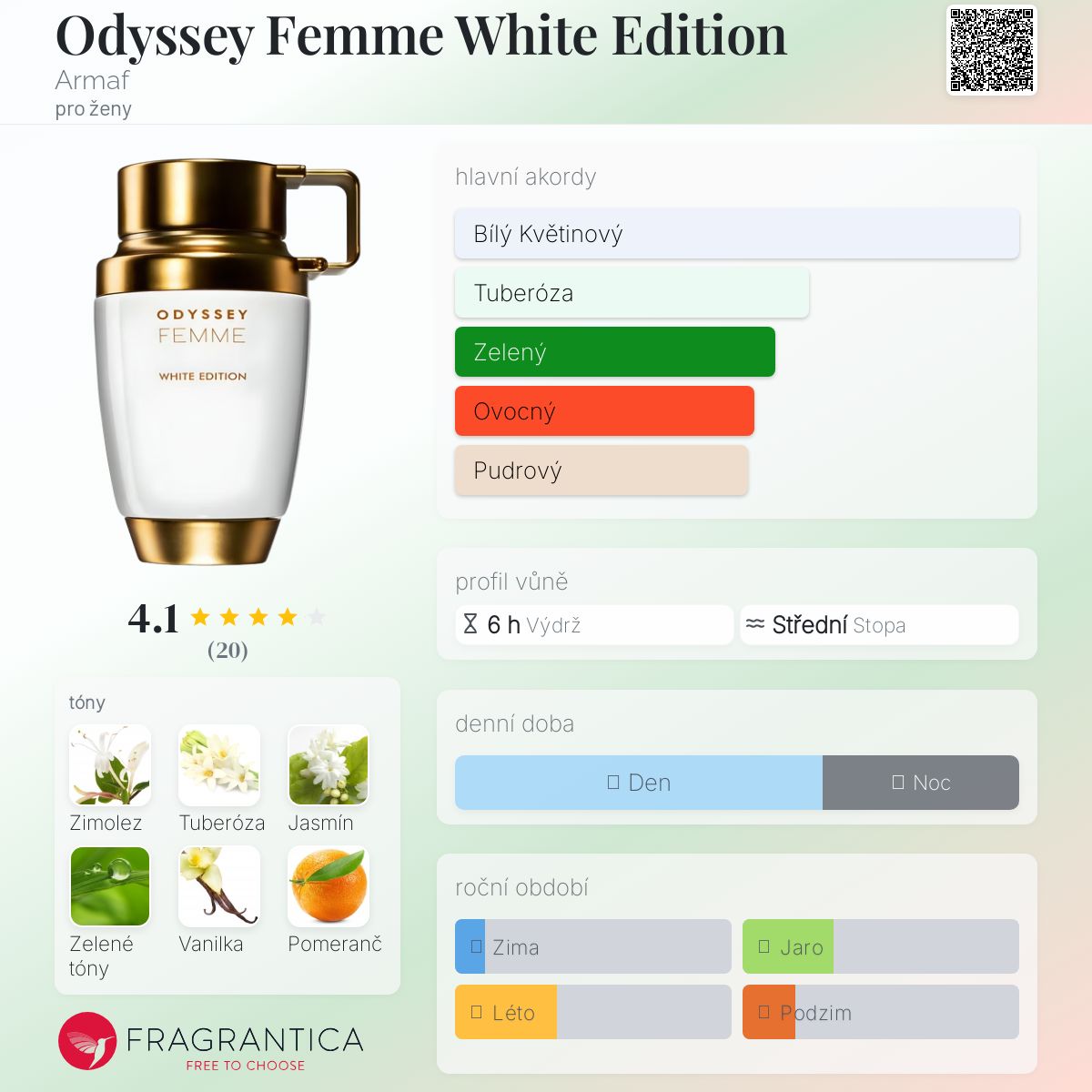 Odyssey Femme White Edition podle Armaf je Orientální Floral vůně pro ženy. Odyssey Femme White Edition byl/a uveden/a v roce 2020. Vrchní tóny jsou Zelené tóny a Pomeranč; střední tóny jsouZimolez, Tuberóza a Egyptský jasmín ; základní tóny jsou Vanilka, Orris a Santalové dřevo.