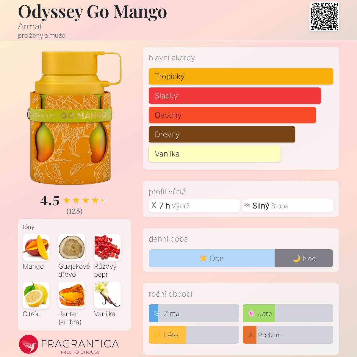 Odyssey Go Mango podle Armaf je Orientální Floral vůně pro ženy a muže. Toto je nová vůně. Odyssey Go Mango byl/a uveden/a v roce 2025. Vrchní tóny jsou Růžový pepř, Citrón, Zázvor a Bílé květy; střední tóny jsouMango, Fazole tonka a Suché dřevo ; základní tóny jsou Guajakové dřevo, Jantar (ambra), Vanilka, Oříškové tóny a Pižmo.