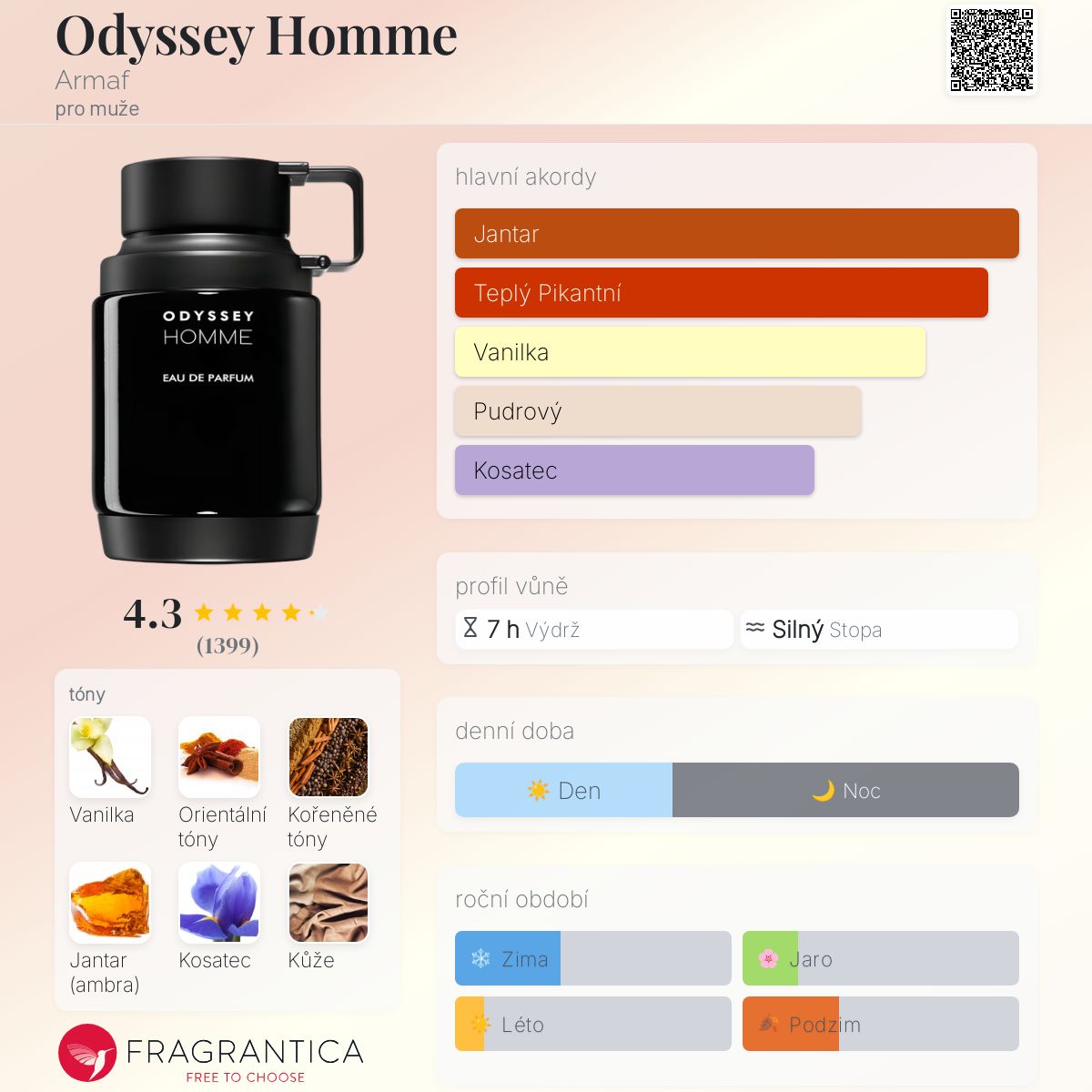 Odyssey Homme podle Armaf je Orientální vůně pro muže. Vrchní tóny jsou Vanilka a Jantar (ambra); střední tóny jsouOrientální tóny, Koření a Kosatec ; základní tóny jsou Vanilka, Kůže a Jasmín.