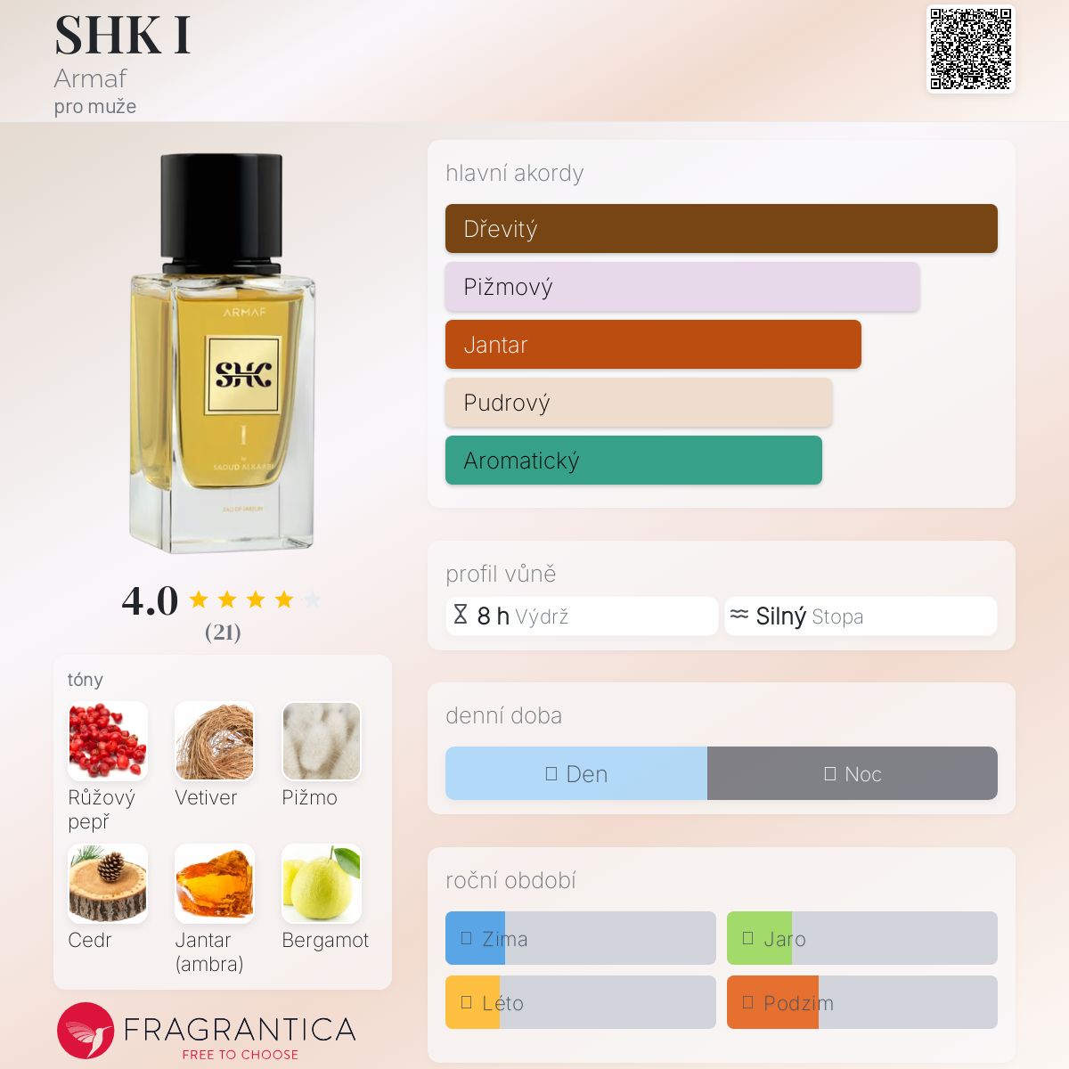 SHK I podle Armaf je Orientální Woody vůně pro muže. Toto je nová vůně. SHK I byl/a uveden/a v roce 2024. Vrchní tón je Bergamot ; střední tóny jsouRůžový pepř, Vetiver a Kašmírové dřevo ; základní tóny jsou Bílé pižmo, Cedr a Jantar (ambra).