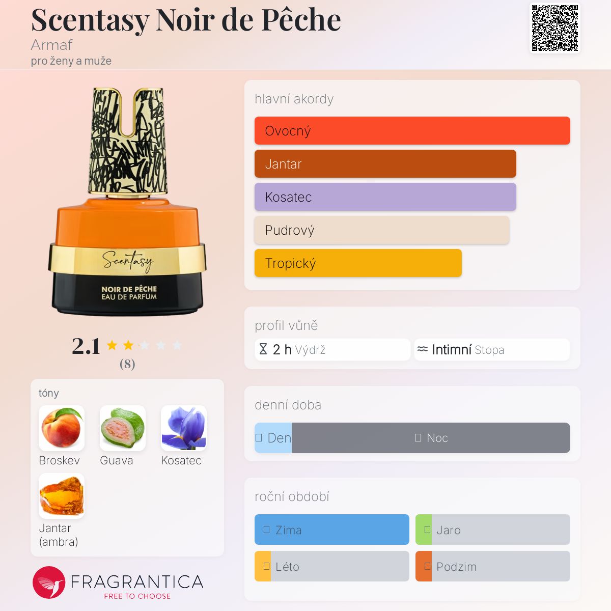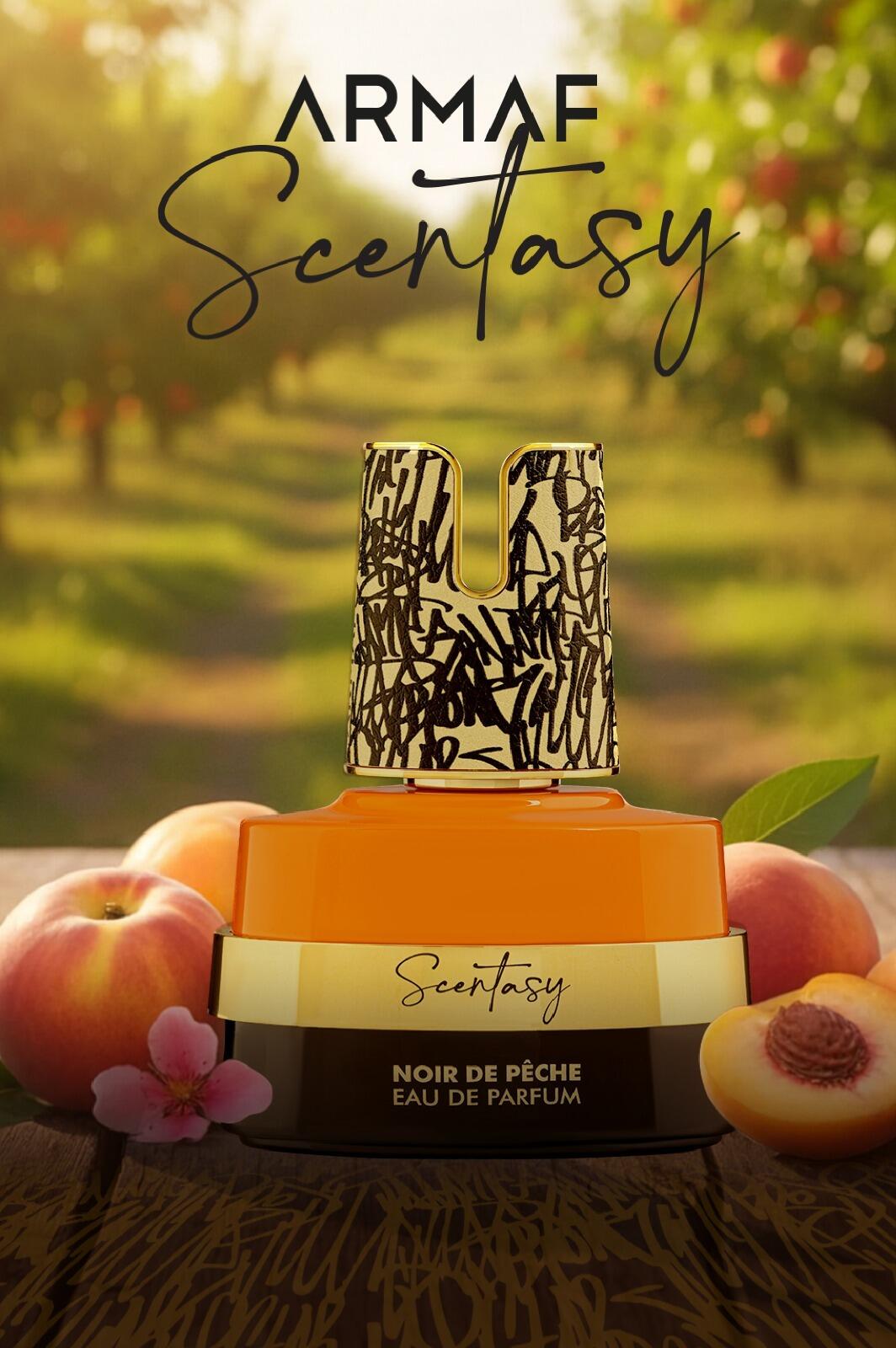 Scentasy Noir de Pêche podle Armaf je Floral Fruity vůně pro ženy a muže. Toto je nová vůně. Scentasy Noir de Pêche byl/a uveden/a v roce 2025. Vrchní tóny jsou Broskev a Guava; střední tón jeKosatec ; základní tón je Jantar (ambra).