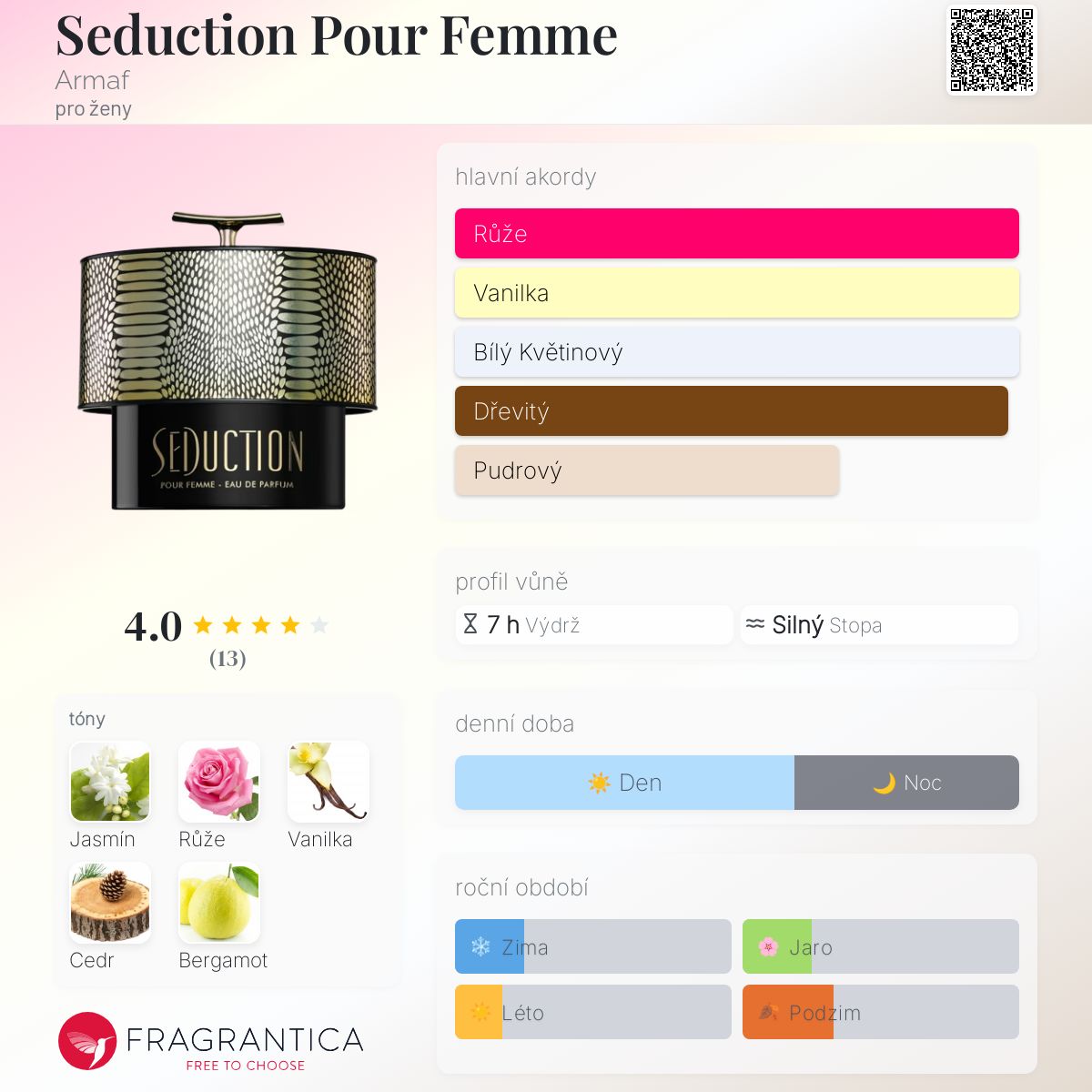Seduction Pour Femme podle Armaf je Orientální Floral vůně pro ženy. Seduction Pour Femme byl/a uveden/a v roce 2020. Vrchní tón je Bergamot ; střední tóny jsouJasmín a Růže ; základní tóny jsou Vanilka a Cedr.