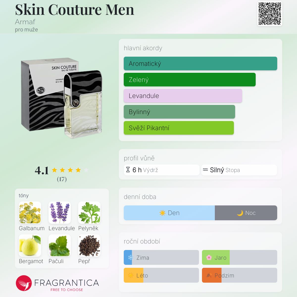 Skin Couture Men podle Armaf je Orientální Fougere vůně pro muže. Vrchní tóny jsou Galbanum, Pelyněk a Bergamot; střední tóny jsouLevandule, Pepř a Šalvěj ; základní tóny jsou Pačuli, Jantar (ambra), Santalové dřevo a Fazole tonka.