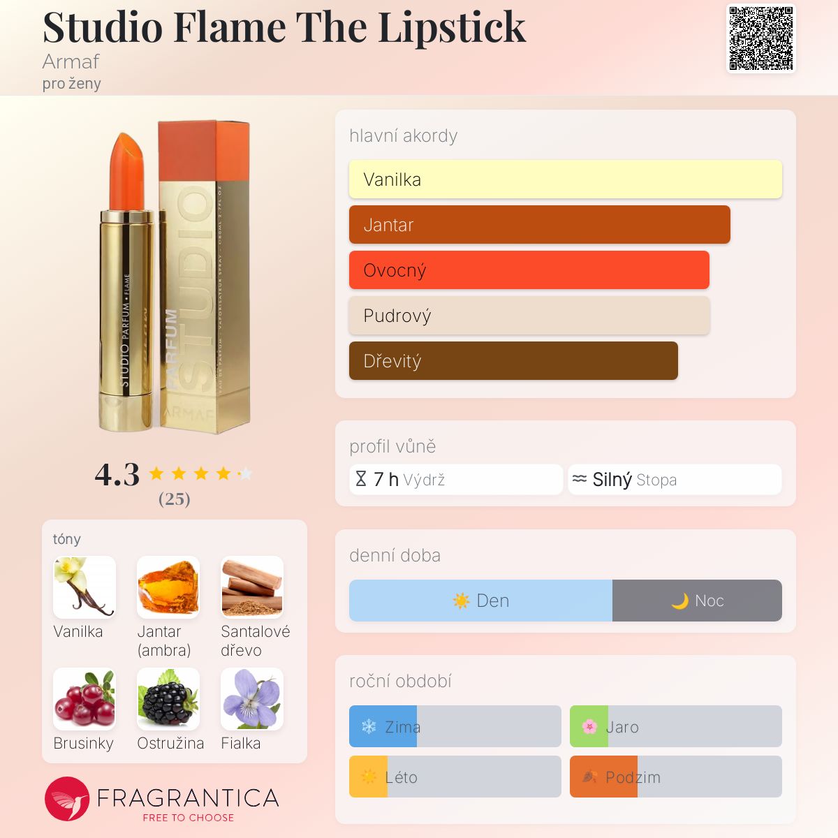 Studio Flame The Lipstick podle Armaf je Floral vůně pro ženy. Studio Flame The Lipstick byl/a uveden/a v roce 2018. Vrchní tóny jsou Brusinky a Ostružina; střední tóny jsouFialka a Pivoňka ; základní tóny jsou Vanilka, Jantar (ambra) a Santalové dřevo.