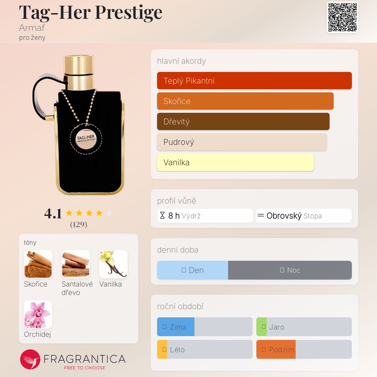 Tag-Her Prestige podle Armaf je Orientální Floral vůně pro ženy. Vrchní tón je Skořice ; střední tón jeOrchidej ; základní tóny jsou Santalové dřevo a Vanilka.