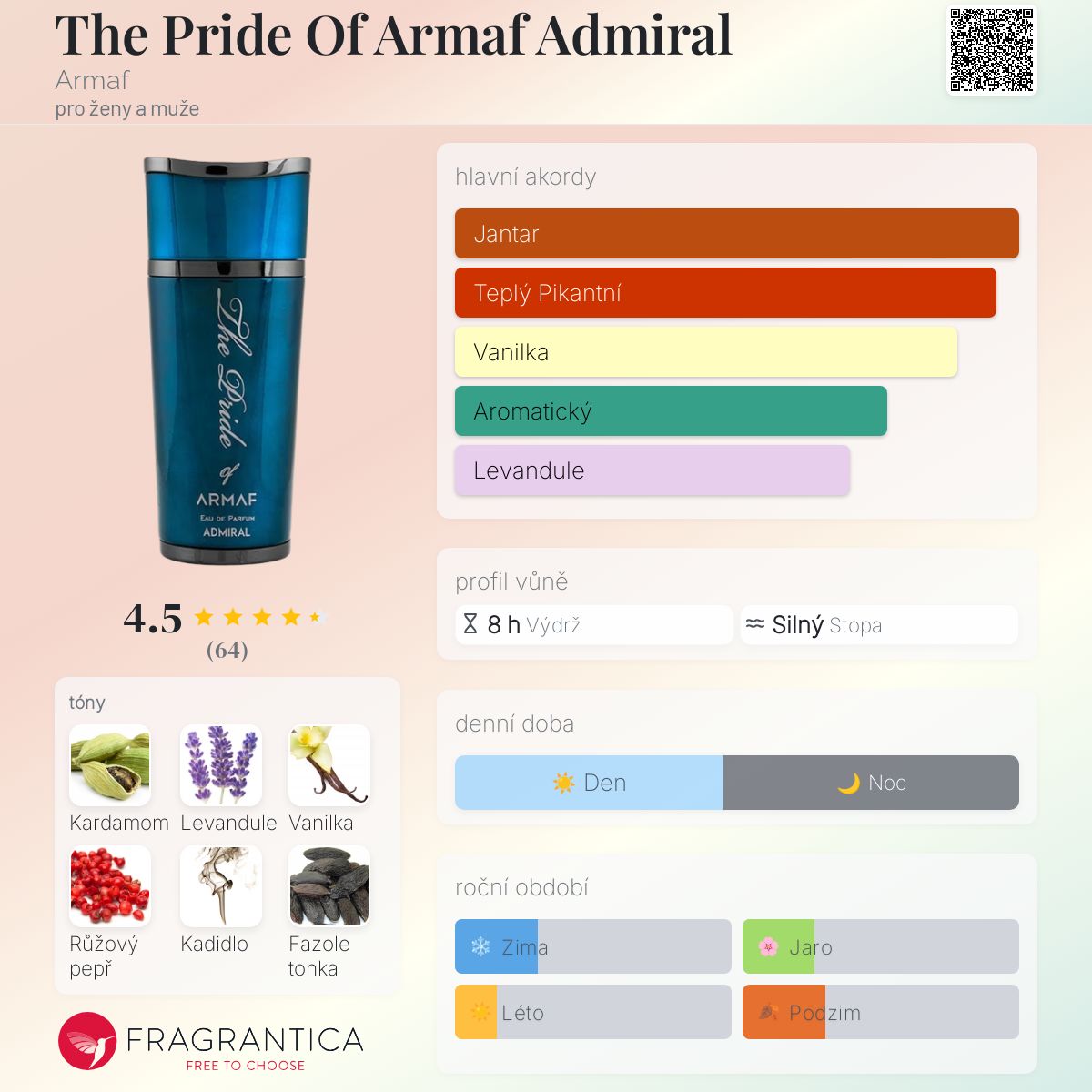 The Pride Of Armaf Admiral podle Armaf je Orientální Vanilla vůně pro ženy a muže. Toto je nová vůně. The Pride Of Armaf Admiral byl/a uveden/a v roce 2024. Vrchní tóny jsou Kardamom a Růžový pepř; střední tóny jsouLevandule a Kadidlo ; základní tóny jsou Vanilka, Fazole tonka, Jantar (ambra) a Pačuli.