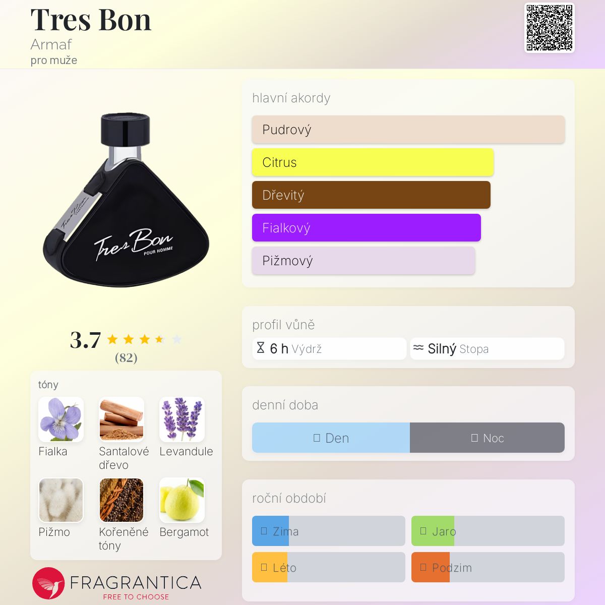 Tres Bon podle Armaf je Woody Spicy vůně pro muže. Vrchní tóny jsou Kořeněné tóny, Bergamot a Citrón; střední tóny jsouFialka, Levandule a Růžový pepř ; základní tóny jsou Santalové dřevo, Pižmo, Vanilka a Jantar (ambra).