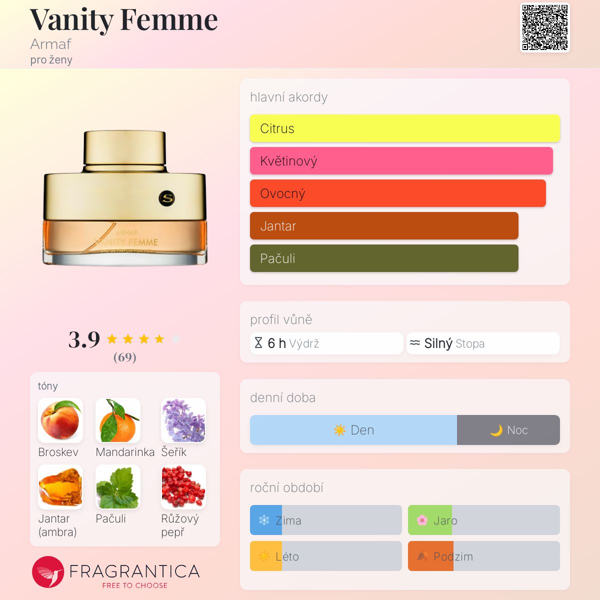 Vanity Femme podle Armaf je Floral Woody Musk vůně pro ženy. Vrchní tóny jsou Broskev, Mandarinka a Růžový pepř; střední tóny jsouŠeřík a Pelargónie ; základní tóny jsou Jantar (ambra) a Pačuli.