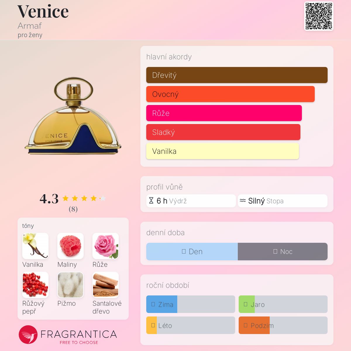 Venice podle Armaf je Orientální Floral vůně pro ženy. Venice byl/a uveden/a v roce 2017. Vrchní tóny jsou Maliny, Růže, Gardénie a Jasmín; střední tóny jsouVanilka, Růžový pepř a Černý rybíz ; základní tóny jsou Pižmo, Santalové dřevo, Pačuli a Vetiver.