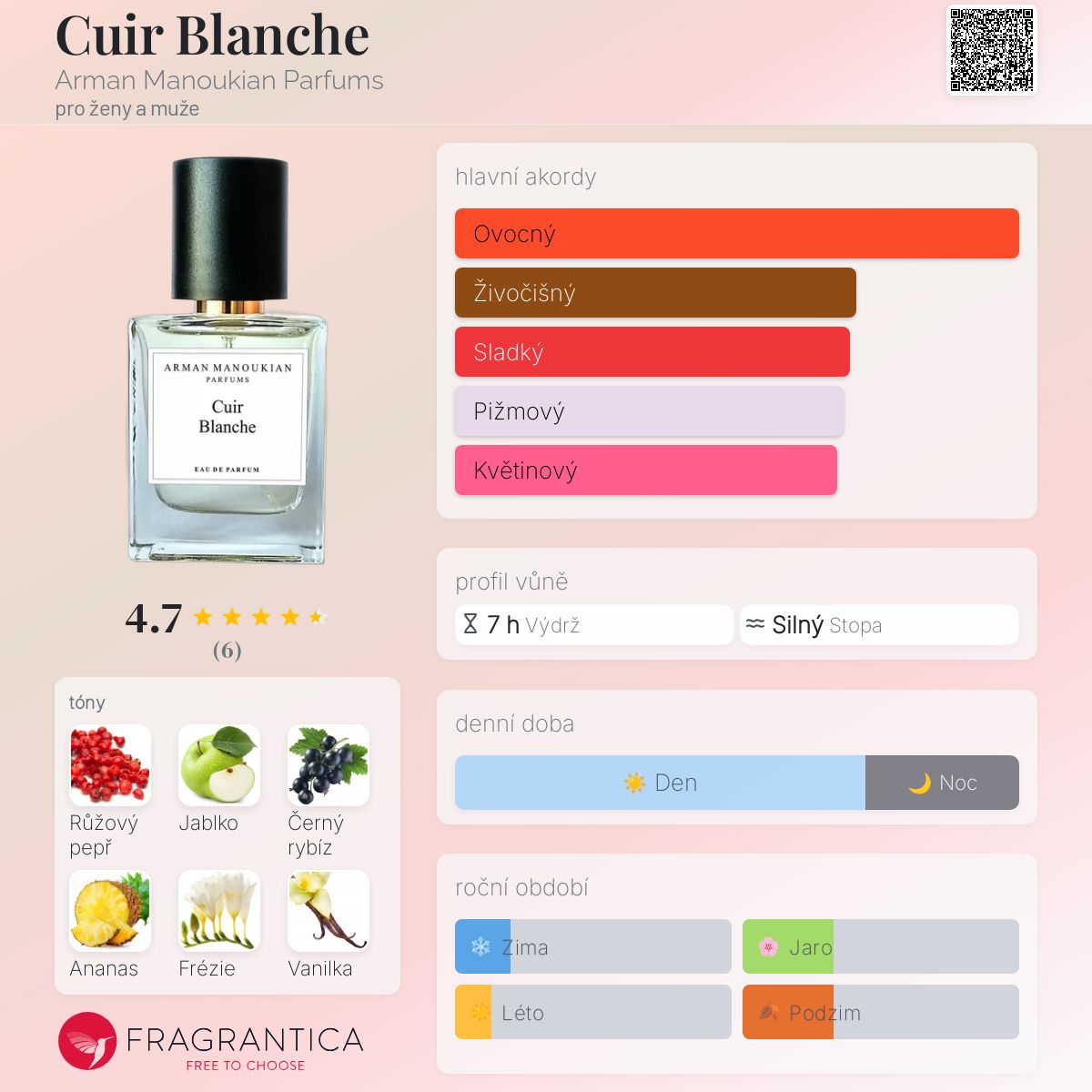 Cuir Blanche podle Arman Manoukian Parfums je Leather vůně pro ženy a muže. Cuir Blanche byl/a uveden/a v roce 2016. "Nosem" za touto vůní je Arman Manoukian. Vrchní tóny jsou Růžový pepř, Zelené jablko, Černý rybíz, Ananas a Bergamot; střední tóny jsouFrézie a Jasmín Sambac ; základní tóny jsou Vanilka, Pižmo, Ambra, Pačuli a Kůže.