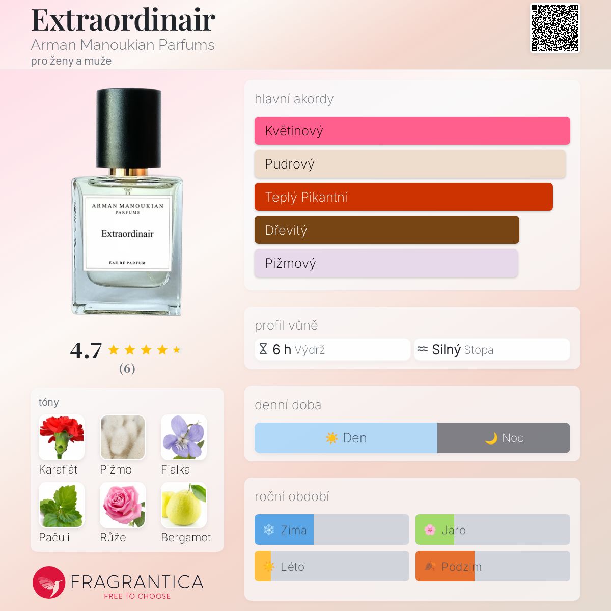 Extraordinair podle Arman Manoukian Parfums je Orientální Woody vůně pro ženy a muže. Extraordinair byl/a uveden/a v roce 2018. "Nosem" za touto vůní je Arman Manoukian. Vrchní tóny jsou Fialka, Bergamot a Růžový pepř; střední tóny jsouKarafiát, Damašská růže, Otočník a Magnólie ; základní tóny jsou Pižmo, Pačuli, Dřevité tóny, Santalové dřevo a Vanilka.