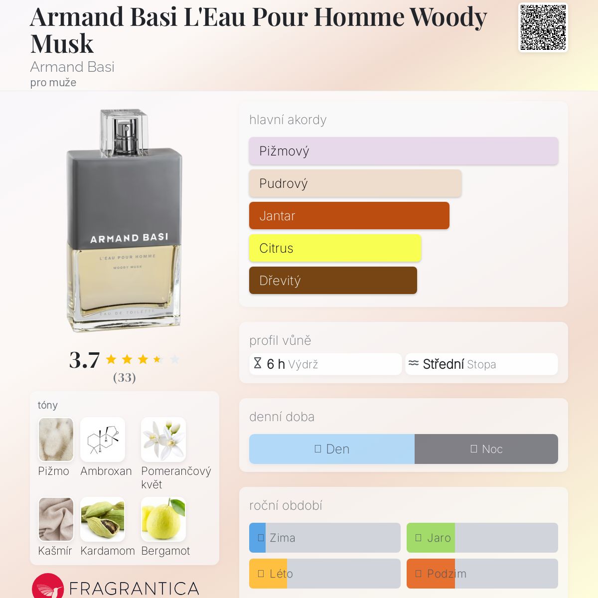 Armand Basi L'Eau Pour Homme Woody Musk podle Armand Basi je Woody Spicy vůně pro muže. Armand Basi L'Eau Pour Homme Woody Musk byl/a uveden/a v roce 2022. Armand Basi L'Eau Pour Homme Woody Musk byl/a vytvořen/a Aurélien Guichard a Jérôme di Marino. Vrchní tóny jsou Kardamom, Bergamot, Citrón, Zázvor a Černý pepř; střední tóny jsouAmbroxan, Pomerančový květ, Šalvěj muškátová a Aldehydy ; základní tóny jsou Pižmo, Kašmír a Atlasový cedr.