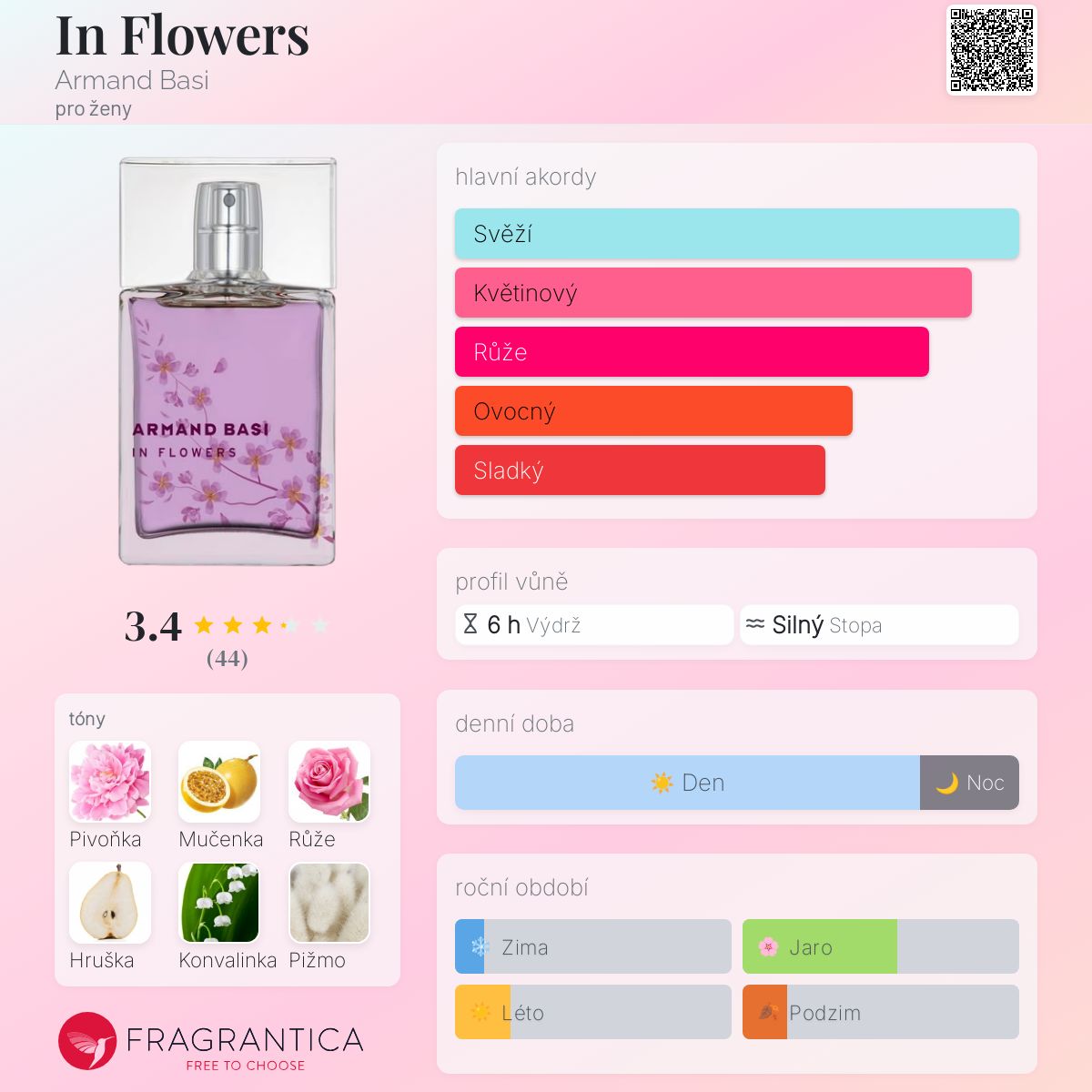 In Flowers podle Armand Basi je Floral Fruity Gourmand vůně pro ženy. In Flowers byl/a uveden/a v roce 2018. "Nosem" za touto vůní je Quentin Bisch. Vrchní tóny jsou Mučenka, Hruška a Bergamot; střední tóny jsouPivoňka, Růže a Konvalinka ; základní tóny jsou Pižmo, Vanilka a Jantar (ambra).