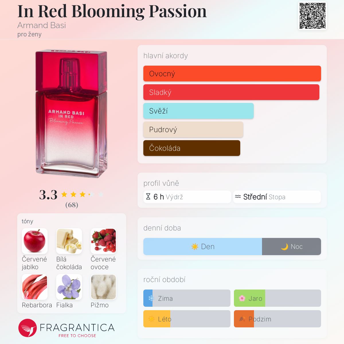 In Red Blooming Passion podle Armand Basi je Floral Fruity Gourmand vůně pro ženy. In Red Blooming Passion byl/a uveden/a v roce 2021. "Nosem" za touto vůní je Nathalie Lorson. Vrchní tóny jsou Červené jablko, Červené ovoce, Rebarbora a Mango; střední tóny jsouFialka, Jasmín a Konvalinka ; základní tóny jsou Bílá čokoláda, Bílé pižmo, Fazole tonka a Santalové dřevo.