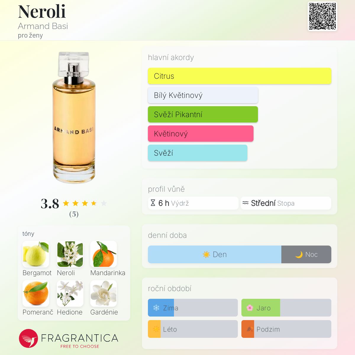Neroli podle Armand Basi je Floral vůně pro ženy. Toto je nová vůně. Neroli byl/a uveden/a v roce 2025. "Nosem" za touto vůní je Alberto Morillas. Vrchní tóny jsou Bergamot, Italská mandarinka a Pomeranč; střední tóny jsouNeroli, Hedione a Gardénie ; základní tóny jsou Jantarové dřevo, Vanilka a Pižmo.