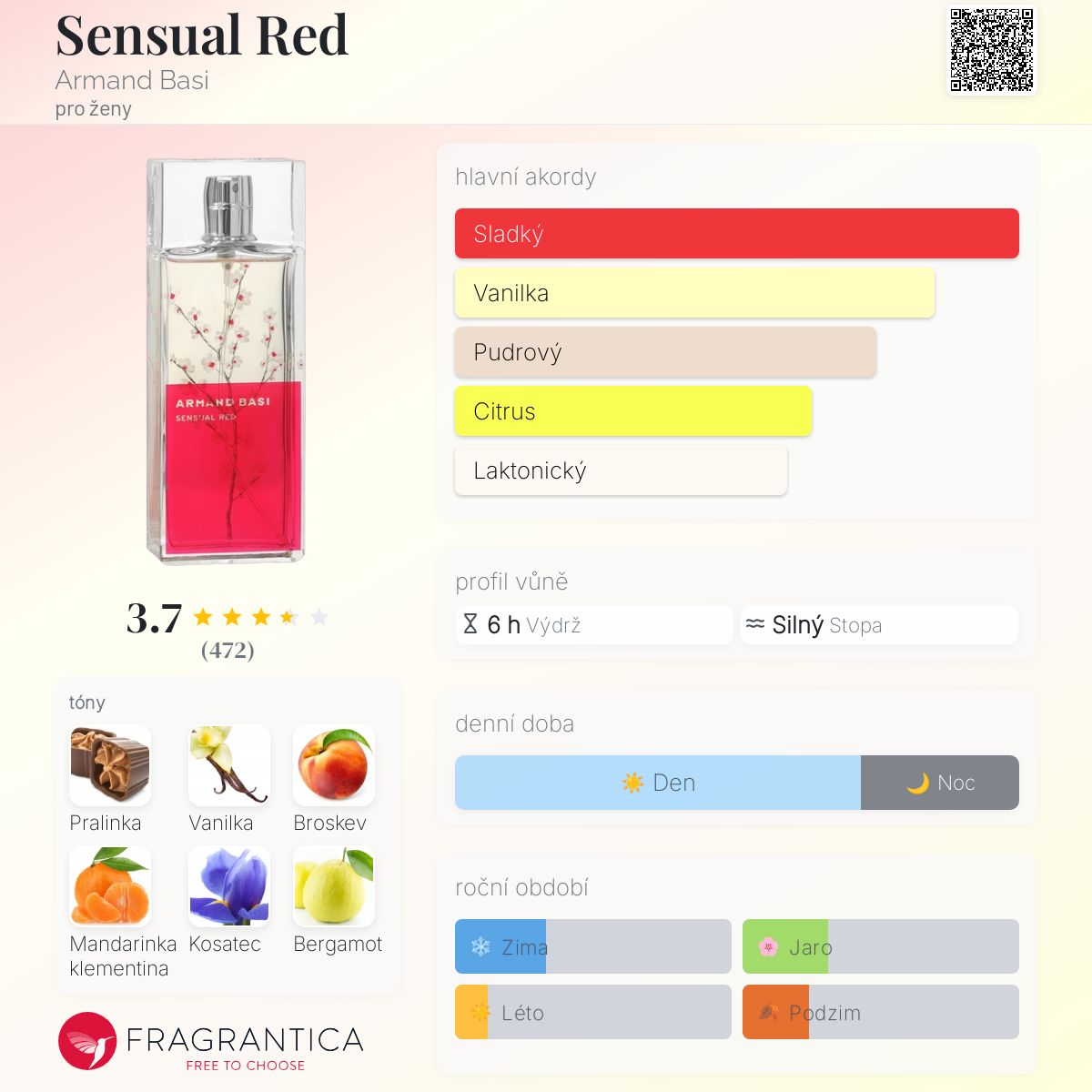 Sensual Red podle Armand Basi je Floral Fruity vůně pro ženy. Sensual Red byl/a uveden/a v roce 2009. Vrchní tóny jsou Broskev, Mandarinka klementina a Bergamot; střední tóny jsouKosatec, Fialka a Otočník ; základní tóny jsou Pralinka, Vanilka, Styrax a Virginský cedr.