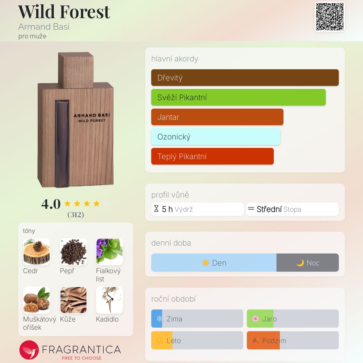 Wild Forest podle Armand Basi je Woody Spicy vůně pro muže. Wild Forest byl/a uveden/a v roce 2013. "Nosem" za touto vůní je Nathalie Lorson. Vrchní tóny jsou Pepř a Muškátový oříšek; střední tóny jsouCedr a Fialkový list ; základní tóny jsou Kůže, Kadidlo, Pižmo, Ambra, Pačuli a Vanilka.