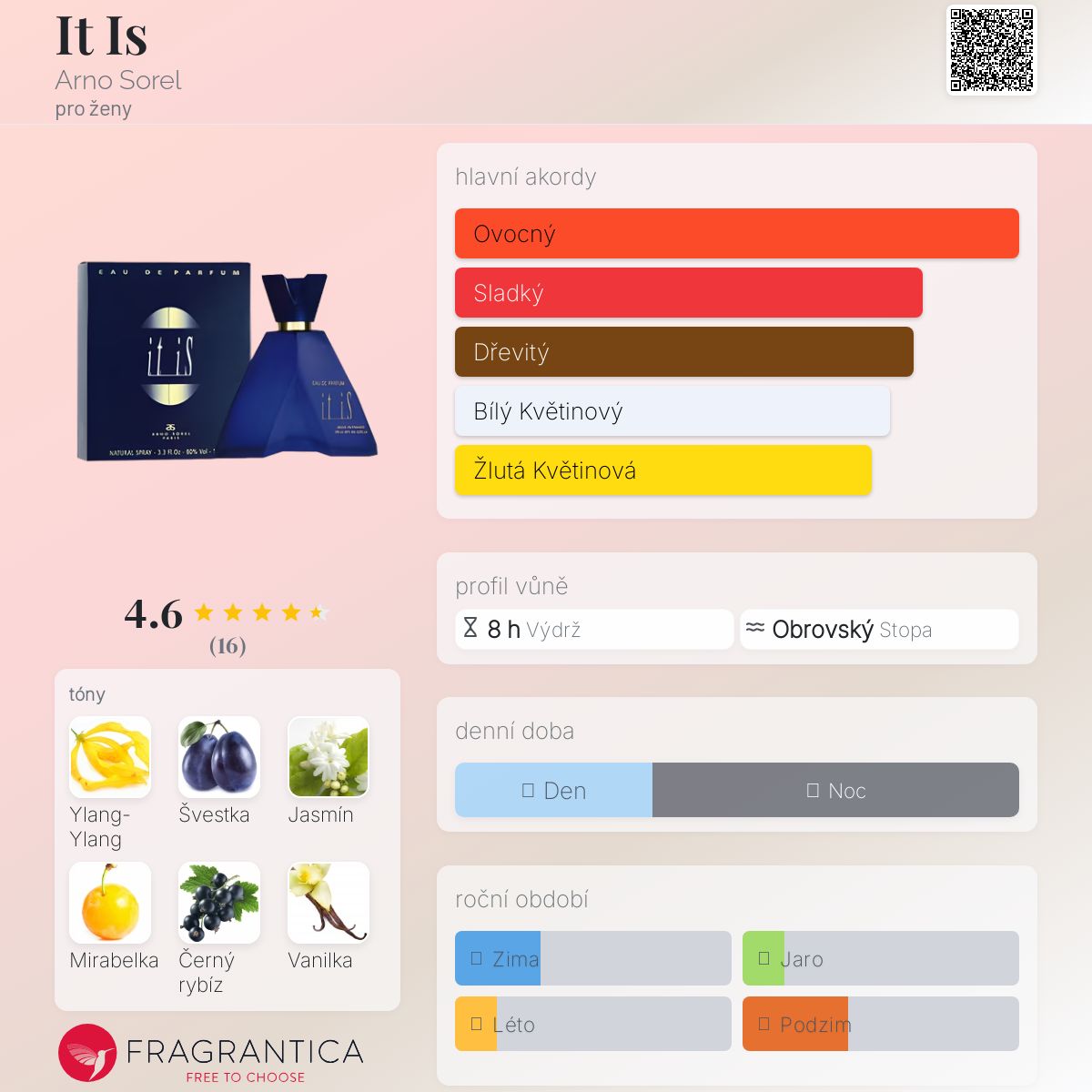 It Is podle Arno Sorel je Floral Fruity vůně pro ženy. Vrchní tóny jsou Švestka, Mirabelka a Grapefruit; střední tóny jsouJasmín, Černý rybíz, Cedr, Neroli a Hyacint ; základní tóny jsou Ylang-Ylang, Vanilka, Benzoin a Vetiver.