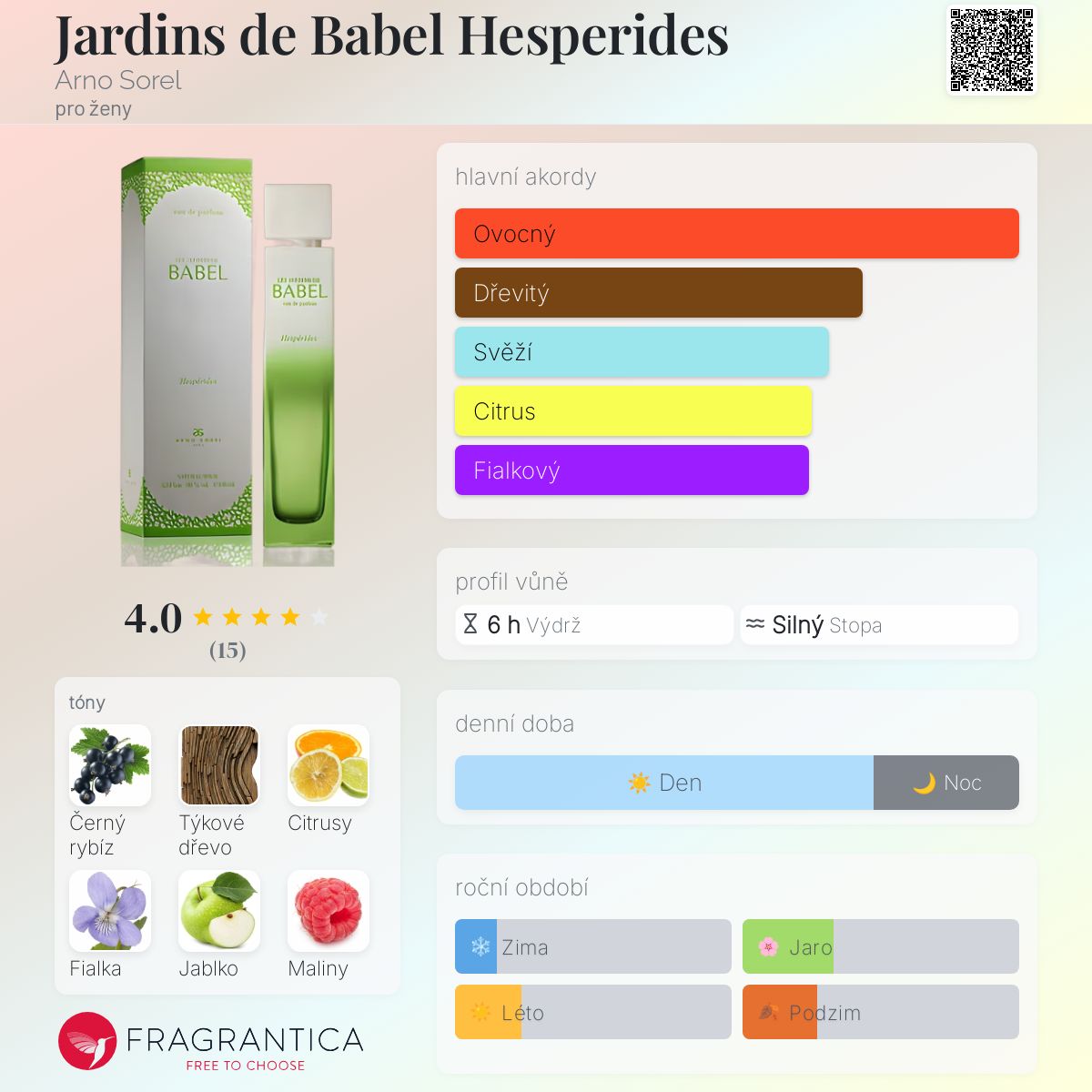 Jardins de Babel Hesperides podle Arno Sorel je Floral Fruity vůně pro ženy. Vrchní tóny jsou Černý rybíz a Citrusy; střední tóny jsouFialka, Granny Smith jablko, Maliny, Jasmín a Růže ; základní tón je Týkové dřevo.