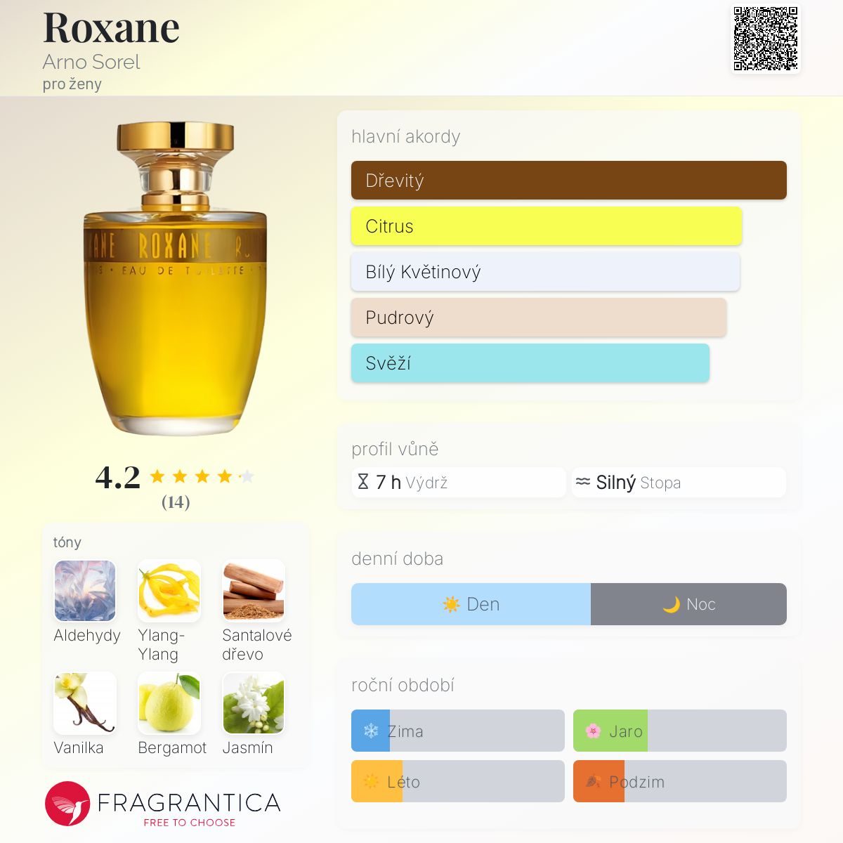 Roxane podle Arno Sorel je Floral Aldehyde vůně pro ženy. Vrchní tóny jsou Aldehydy, Bergamot, Citrón a Neroli; střední tóny jsouYlang-Ylang, Jasmín, Konvalinka a Kořen orris ; základní tóny jsou Santalové dřevo, Vanilka, Cedr, Jantar (ambra) a Pižmo.