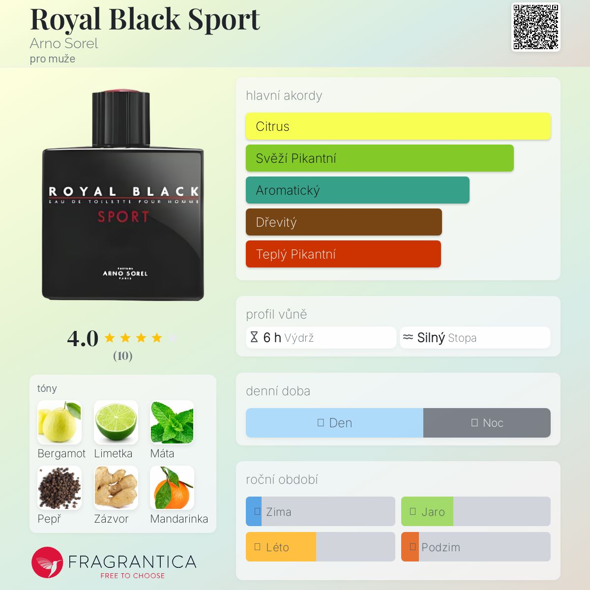 Royal Black Sport podle Arno Sorel je Citrus Aromatic vůně pro muže. Vrchní tóny jsou Bergamot, Limetka, Mandarinka a Grapefruit; střední tóny jsouMáta, Pepř, Zázvor, Muškátový oříšek a Pelargónie ; základní tóny jsou Vetiver, Santalové dřevo, Dubový mech, Pačuli, Cedr a Jantar (ambra).