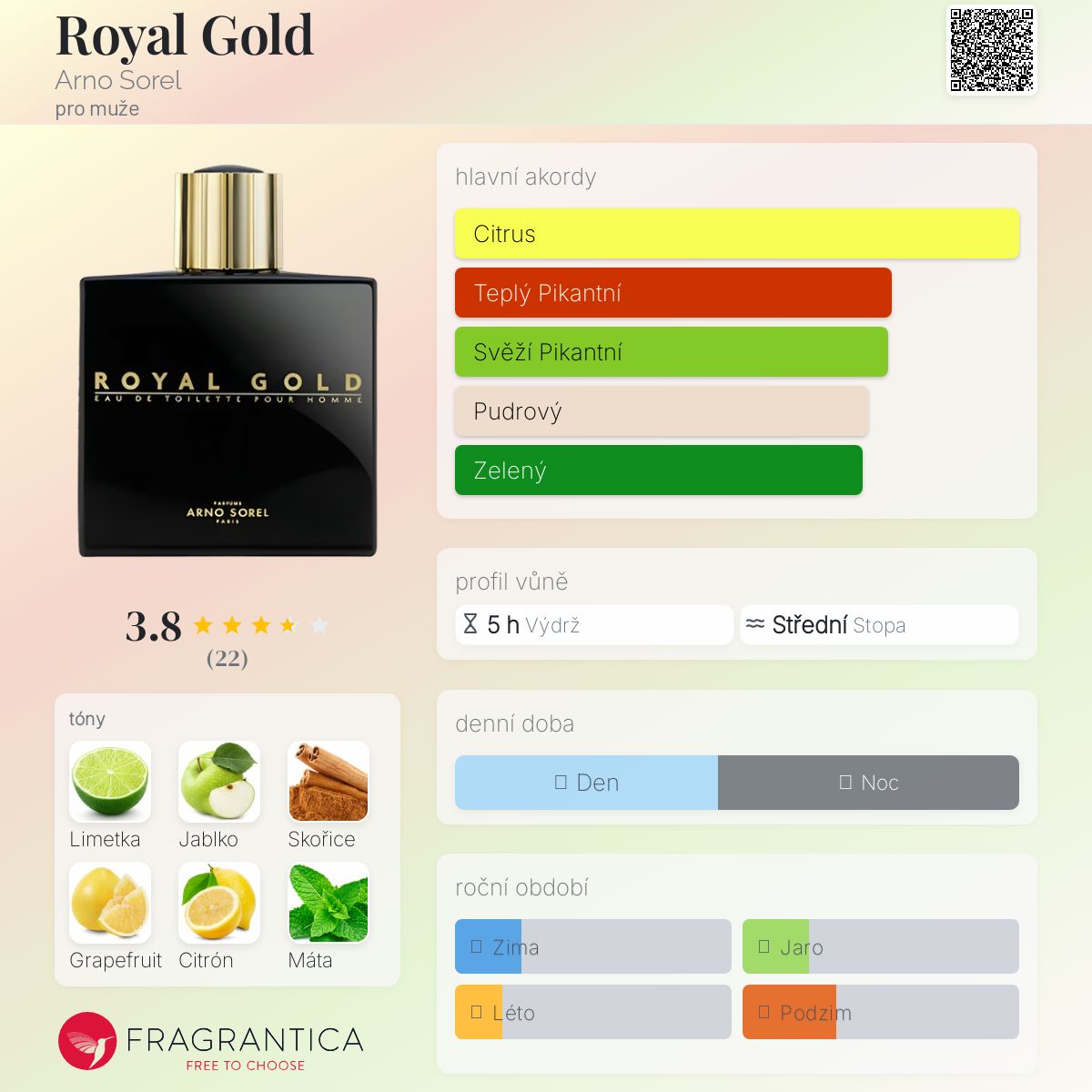 Royal Gold podle Arno Sorel je Woody Spicy vůně pro muže. Vrchní tóny jsou Limetka, Jablko, Grapefruit a Citrón; střední tóny jsouSkořice, Máta, Muškátový oříšek, Fialka a Hřebíček ; základní tóny jsou Pižmo, Cedr, Jantar (ambra), Vanilka a Santalové dřevo.