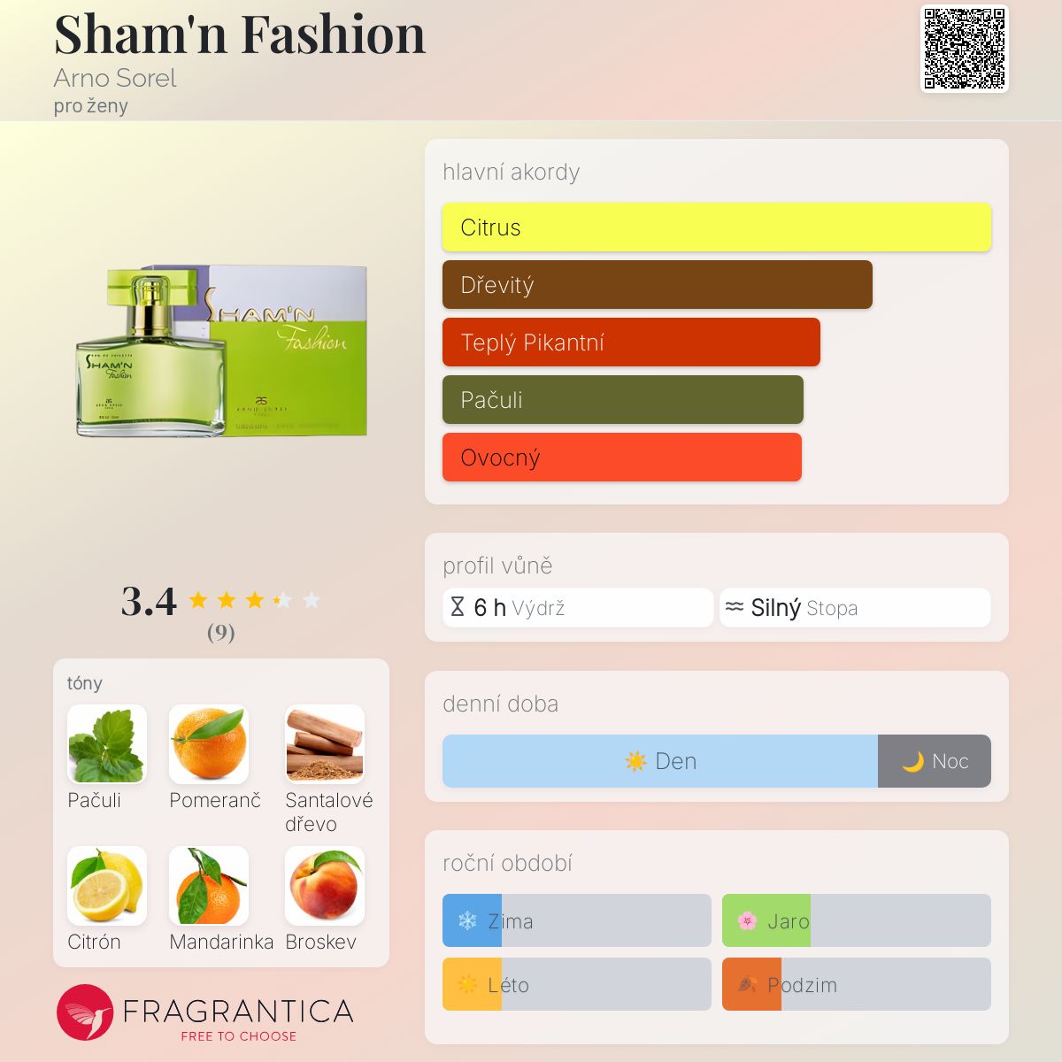 Sham'n Fashion podle Arno Sorel je Floral Fruity vůně pro ženy. Vrchní tóny jsou Pomeranč, Citrón a Mandarinka; střední tóny jsouBroskev, Švestka, Růže, Jasmín, Fialka a Konvalinka ; základní tóny jsou Pačuli, Santalové dřevo, Benzoin, Jantar (ambra), Vanilka, Dubový mech a Pižmo.