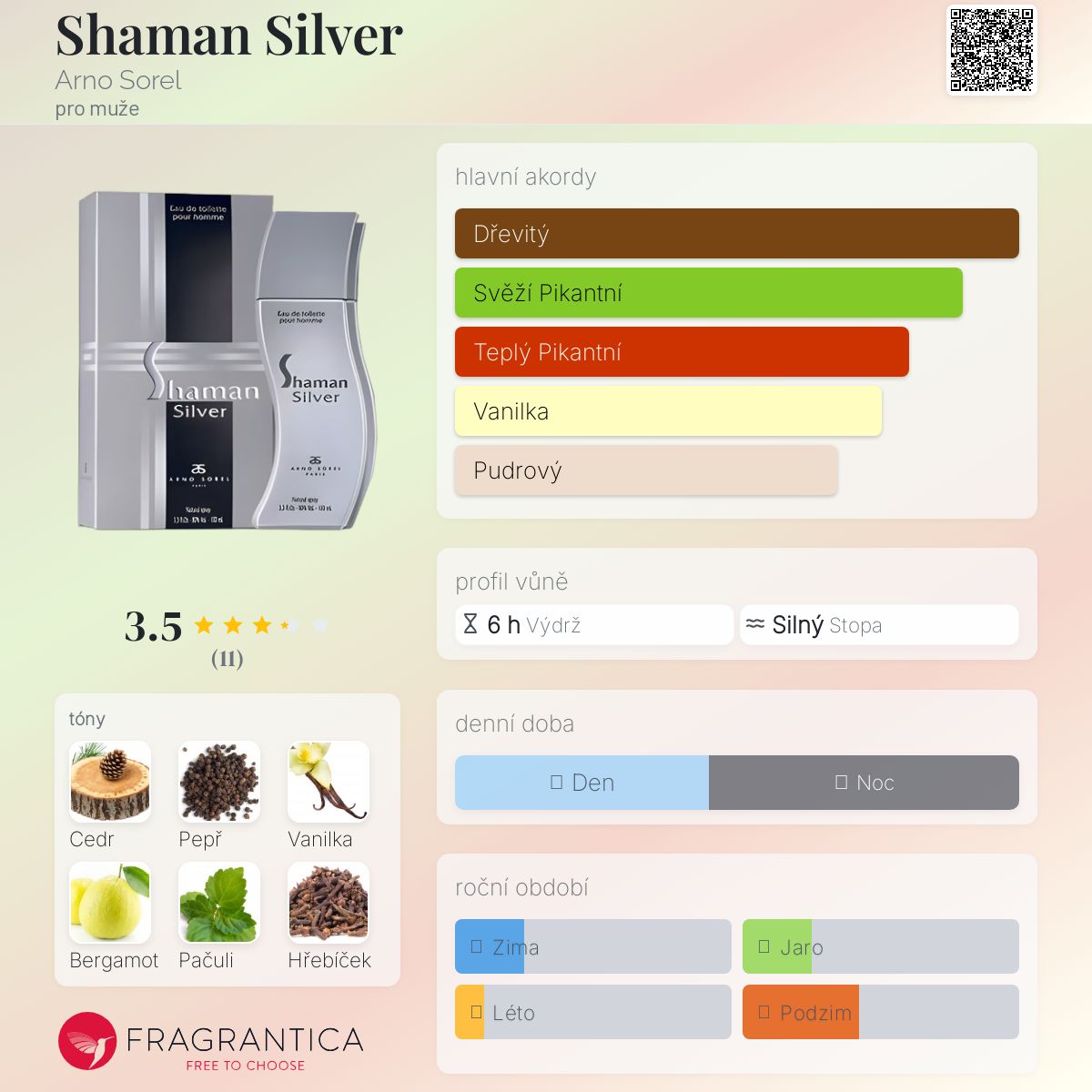Shaman Silver podle Arno Sorel je Woody Aromatic vůně pro muže. Vrchní tóny jsou Pepř, Bergamot, Hřebíček a Černý rybíz; střední tóny jsouCedr, Pačuli a Vetiver ; základní tóny jsou Vanilka, Jantar (ambra), Pižmo a Benzoin.