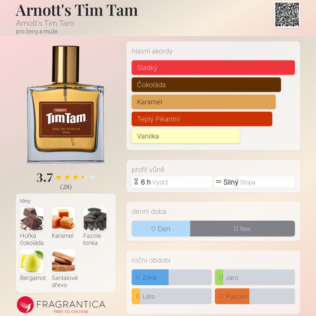 Arnott's Tim Tam podle Arnott's Tim Tam je Woody Aromatic vůně pro ženy a muže. Arnott's Tim Tam byl/a uveden/a v roce 2022. Vrchní tóny jsou Karamel a Bergamot; střední tón jeČokoláda ; základní tóny jsou Fazole tonka a Santalové dřevo.