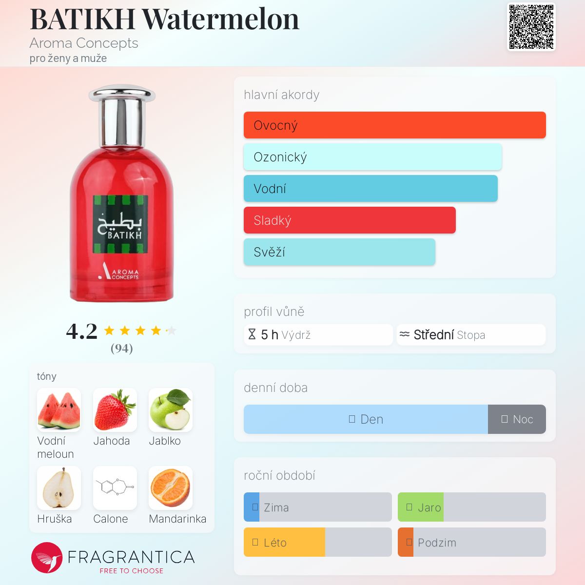 BATIKH Watermelon podle Aroma Concepts je vůně pro ženy a muže. BATIKH Watermelon byl/a uveden/a v roce 2022. Vrchní tóny jsou Hruška, Calone a Mandarinka; střední tóny jsouVodní meloun, Jahoda, Jablko a Růže ; základní tóny jsou Pižmo a Pralinka.