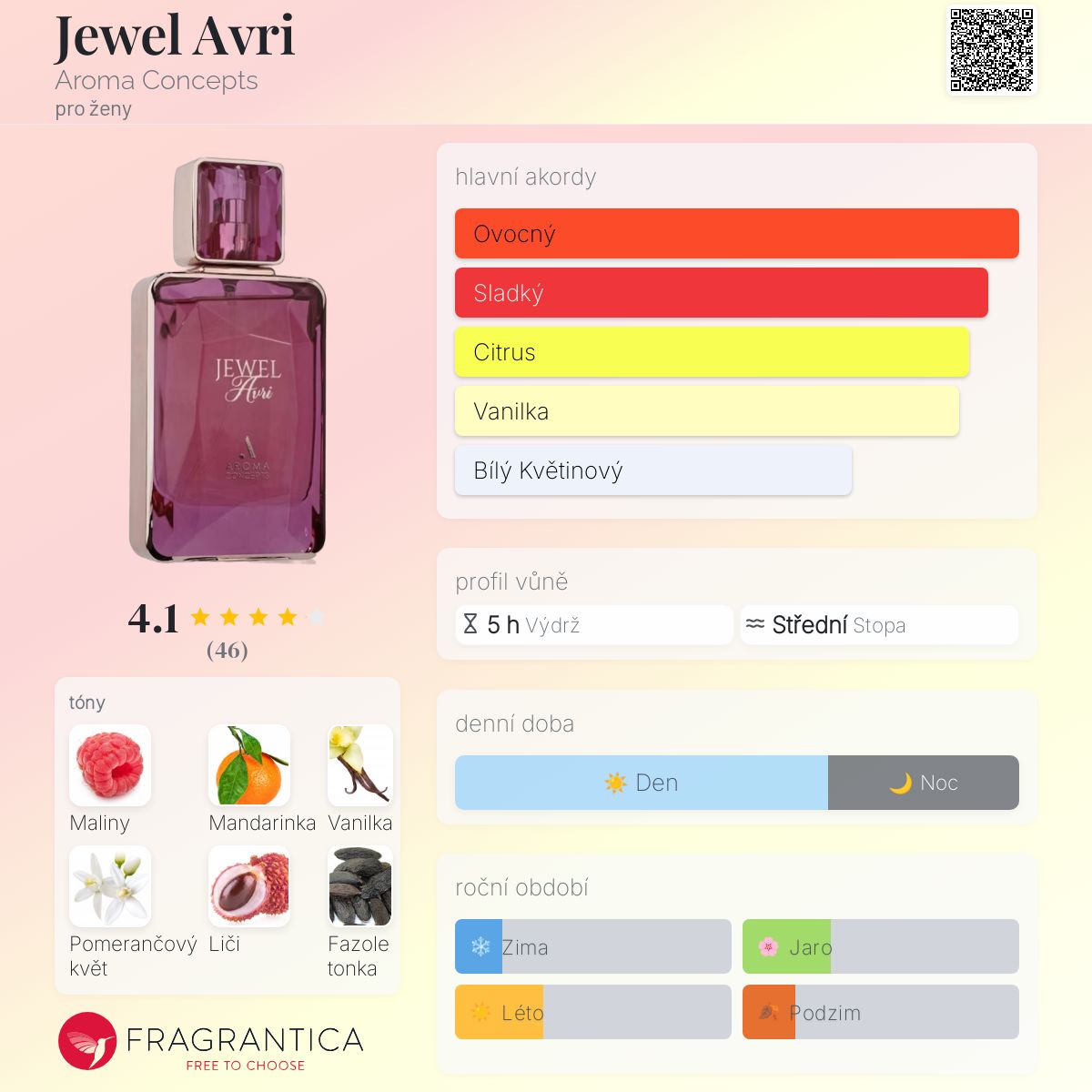 Jewel Avri podle Aroma Concepts je vůně pro ženy. Jewel Avri byl/a uveden/a v roce 2024. Vrchní tóny jsou Maliny, Mandarinka a Liči; střední tóny jsouVanilkový lusk, Pomerančový květ, Fazole tonka a Růže ; základní tóny jsou Vanilka, Pižmo a Cedr.