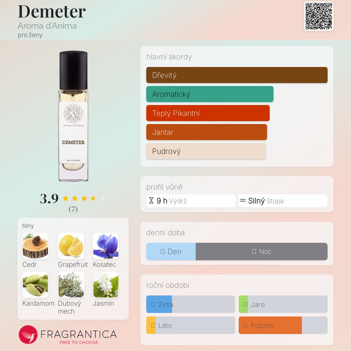 Demeter podle Aroma d'Anima je Orientální Floral vůně pro ženy. Demeter byl/a uveden/a v roce 2017. "Nosem" za touto vůní je Anna Sivacheva. Vrchní tón je Bílý grapefruit ; střední tóny jsouKosatec, Kardamom, Jasmín, Jantar (ambra), Bílý pepř, Vanilka a Magnólie ; základní tóny jsou Cedr, Dubový mech, Guajakové dřevo, Elimi, Copahu balzám a Benzoin.