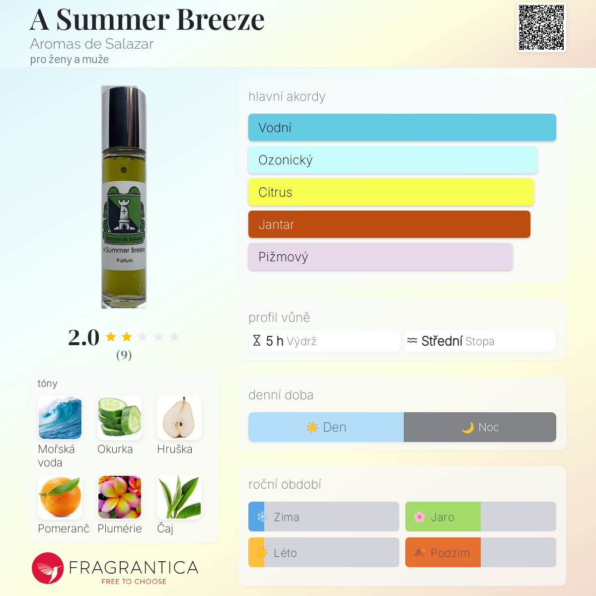 A Summer Breeze podle Aromas de Salazar je Floral Woody Musk vůně pro ženy a muže. A Summer Breeze byl/a uveden/a v roce 2022. "Nosem" za touto vůní je Michael Salazar. Vrchní tóny jsou Mořské tóny, Okurka, Hruška, Sladký pomeranč, Citrón a Sicilský bergamot; střední tóny jsouPlumérie, Zelený čaj, Fialkový list, Pačuli, Pelargónie, Neroli a Eukalyptus ; základní tóny jsou Bílé pižmo, Ambra, Iso E Super, Ambroxan, Půdní tinktura a Virginský cedr.