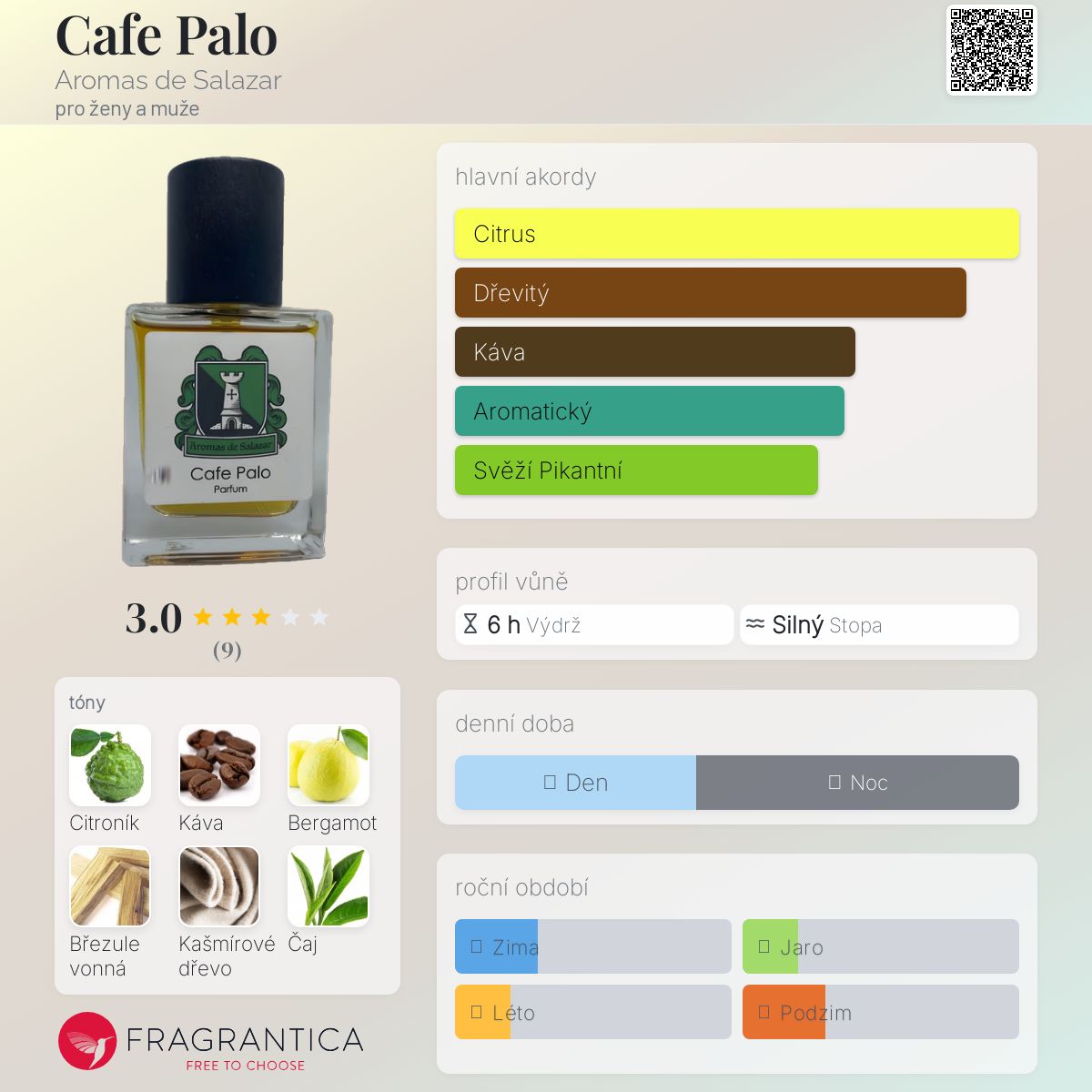 Cafe Palo podle Aromas de Salazar je Woody Aromatic vůně pro ženy a muže. Cafe Palo byl/a uveden/a v roce 2021. "Nosem" za touto vůní je Michael Salazar. Vrchní tóny jsou Citroník, Bergamot a Černý rybíz; střední tóny jsouČerný čaj, Chryzantéma a Pelargónie ; základní tóny jsou Káva, Březule vonná, Kašmírové dřevo, Atlasový cedr, Maté, Otruby, Styrax a Extrakty CO2.