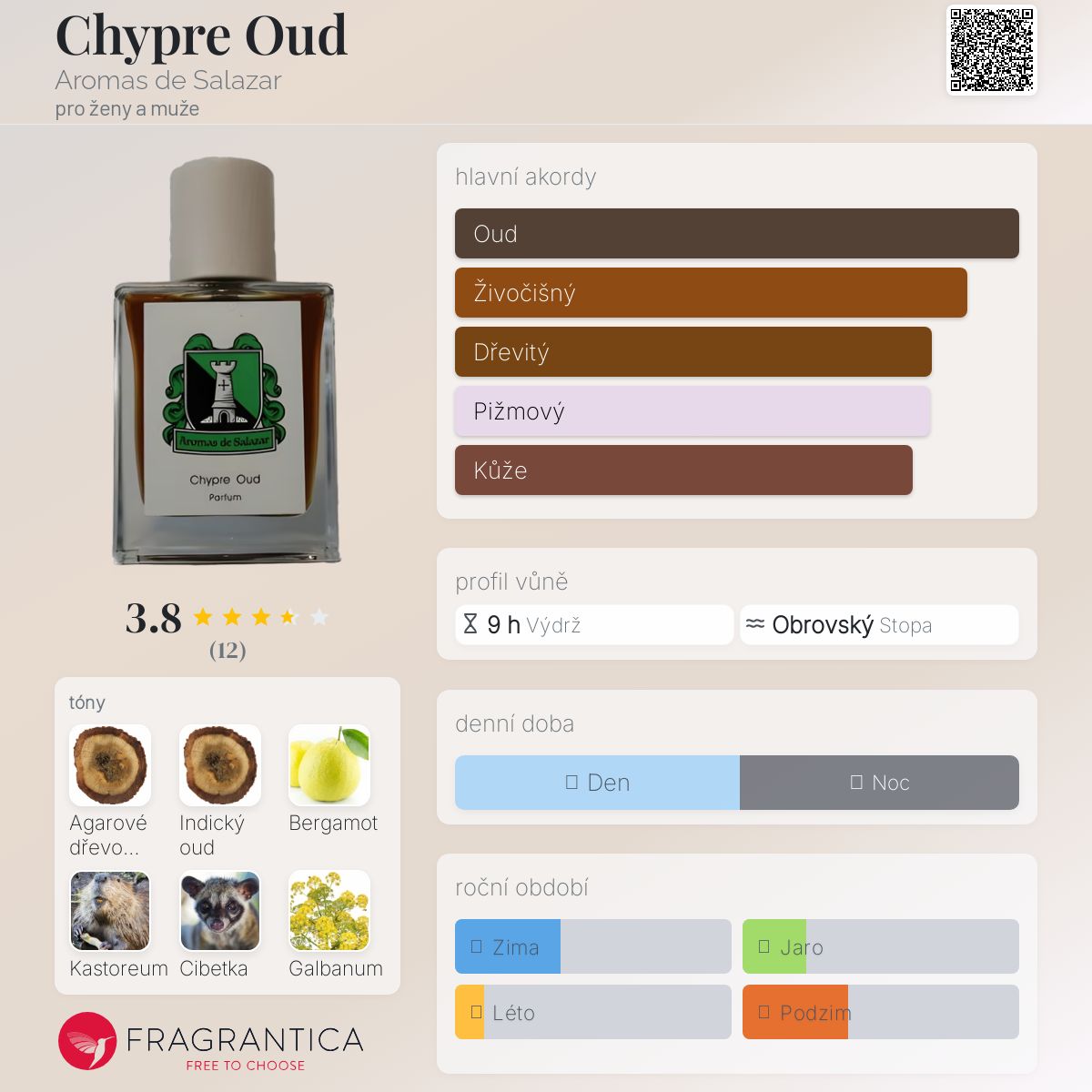 Chypre Oud podle Aromas de Salazar je Chypre vůně pro ženy a muže. Chypre Oud byl/a uveden/a v roce 2023. "Nosem" za touto vůní je Michael Salazar. Vrchní tóny jsou Sicilský bergamot, Galbanum a Černý rybíz; střední tóny jsouTmavé pačuli, Španělský jasmín, Bulharská růže, Indická tuberóza, Magnólie champaca a Levandule ; základní tóny jsou Agarové dřevo (oud), Indický oud, Kastoreum, Cibetka, Dubový mech, Ruská kůže, Orris, Ambra, Fazole tonka, Haitský vetiver, Kakao, Španělské labdanum, Borovice, Pižmo, Olibanum, Jantar (ambra) a Madagaskarská vanilka.