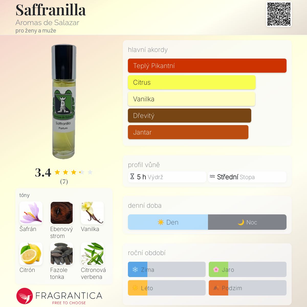 Saffranilla podle Aromas de Salazar je Orientální Spicy vůně pro ženy a muže. Saffranilla byl/a uveden/a v roce 2022. "Nosem" za touto vůní je Michael Salazar. Vrchní tóny jsou Šafrán, Argentinský citron a Kalábrijský bergamot; střední tóny jsouCitronová verbena, Chryzantéma a Magnólie ; základní tóny jsou Ebenové dřevo, Vanilka, Fazole tonka, Ambra, Slaměnka, Pačuli, Maté, Olibanum, Myrha a Pižmo.
