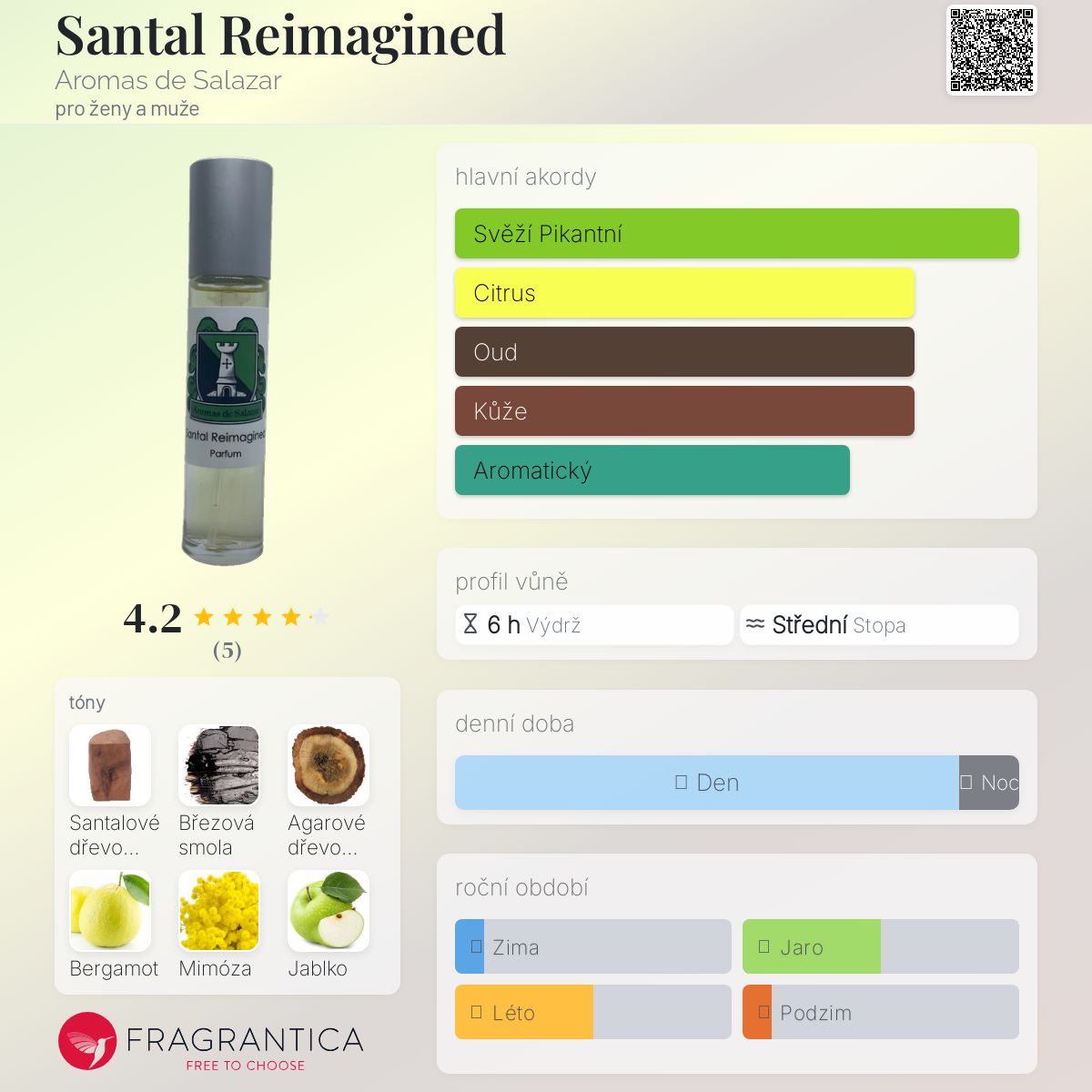 Santal Reimagined podle Aromas de Salazar je Woody Spicy vůně pro ženy a muže. Santal Reimagined byl/a uveden/a v roce 2021. "Nosem" za touto vůní je Michael Salazar. Vrchní tóny jsou Kalábrijský bergamot, Zelené jablko a Sečuánský pepř; střední tóny jsouSantalové dřevo Mysore, Mimóza, Španělský jasmín a Jalovcové bobulky ; základní tóny jsou Březová smola a Agarové dřevo (oud).