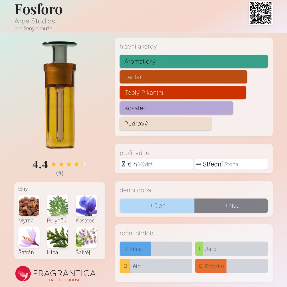 Fosforo podle Arpa Studios je vůně pro ženy a muže. Fosforo byl/a uveden/a v roce 2023. Vrchní tóny jsou Šafrán a Petitgrain; střední tóny jsouMyrha, Kosatec a Šalvěj ; základní tóny jsou Pelyněk a Hiba.