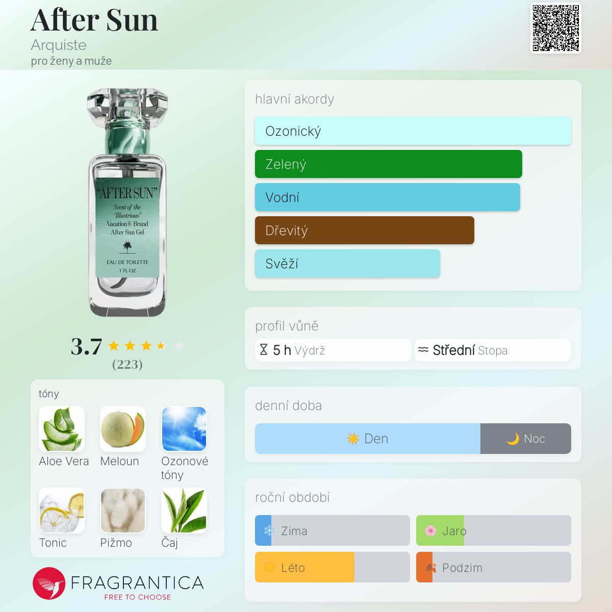 After Sun podle Arquiste je Aromatic vůně pro ženy a muže. Toto je nová vůně. After Sun byl/a uveden/a v roce 2024. Vrchní tóny jsou Aloe Vera, Meloun a Zelený čaj; střední tóny jsouOzonové tóny, Tonic, Gin a Kardamom ; základní tón je Pižmo.