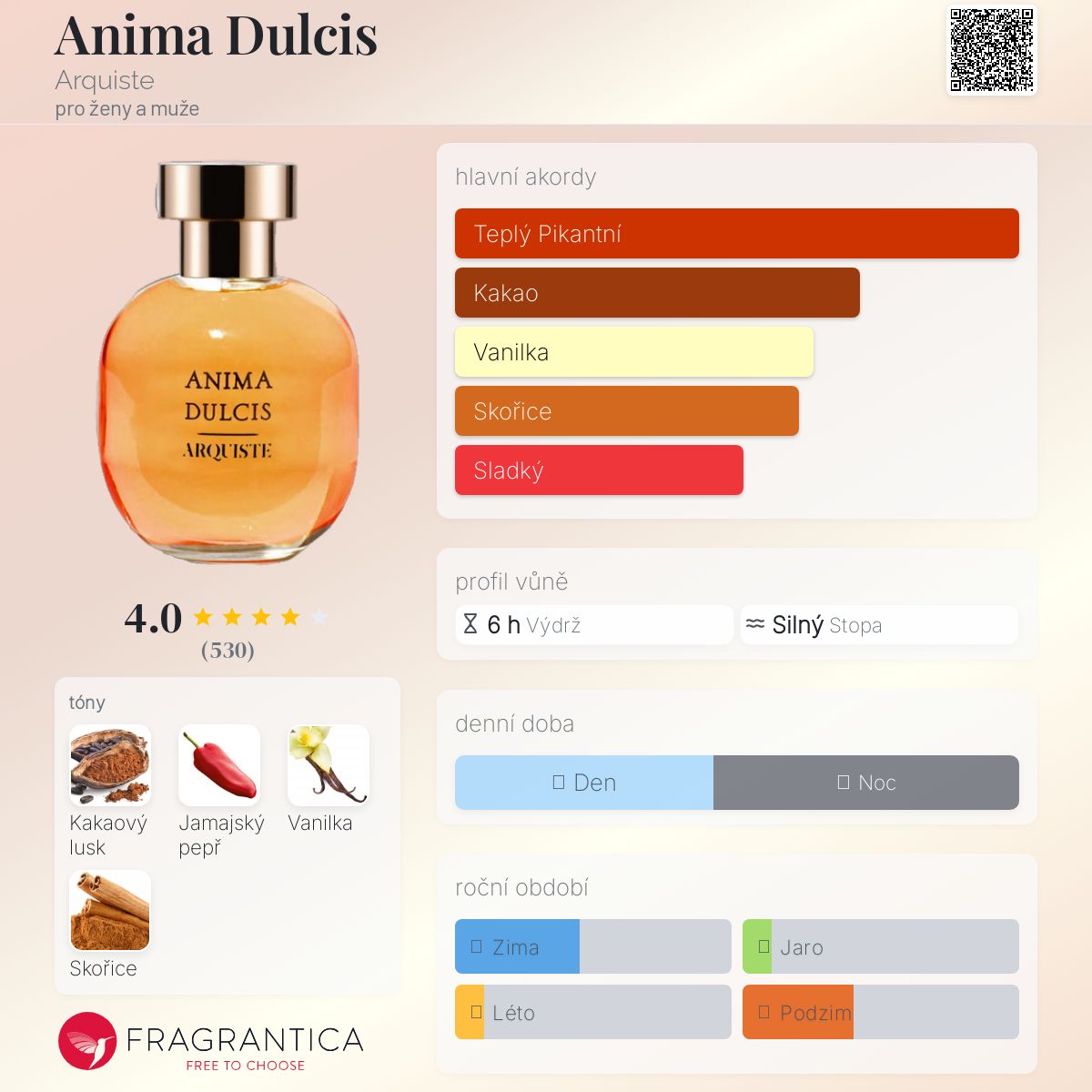 Anima Dulcis podle Arquiste je Orientální Vanilla vůně pro ženy a muže. Anima Dulcis byl/a uveden/a v roce 2012. Anima Dulcis byl/a vytvořen/a Rodrigo Flores-Roux a Yann Vasnier.