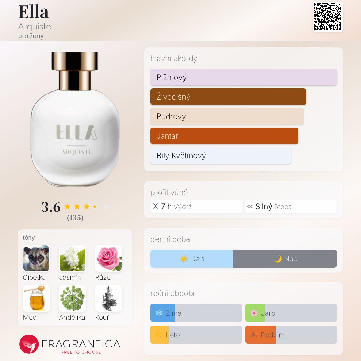 Ella podle Arquiste je Chypre vůně pro ženy. Ella byl/a uveden/a v roce 2016. "Nosem" za touto vůní je Rodrigo Flores-Roux.